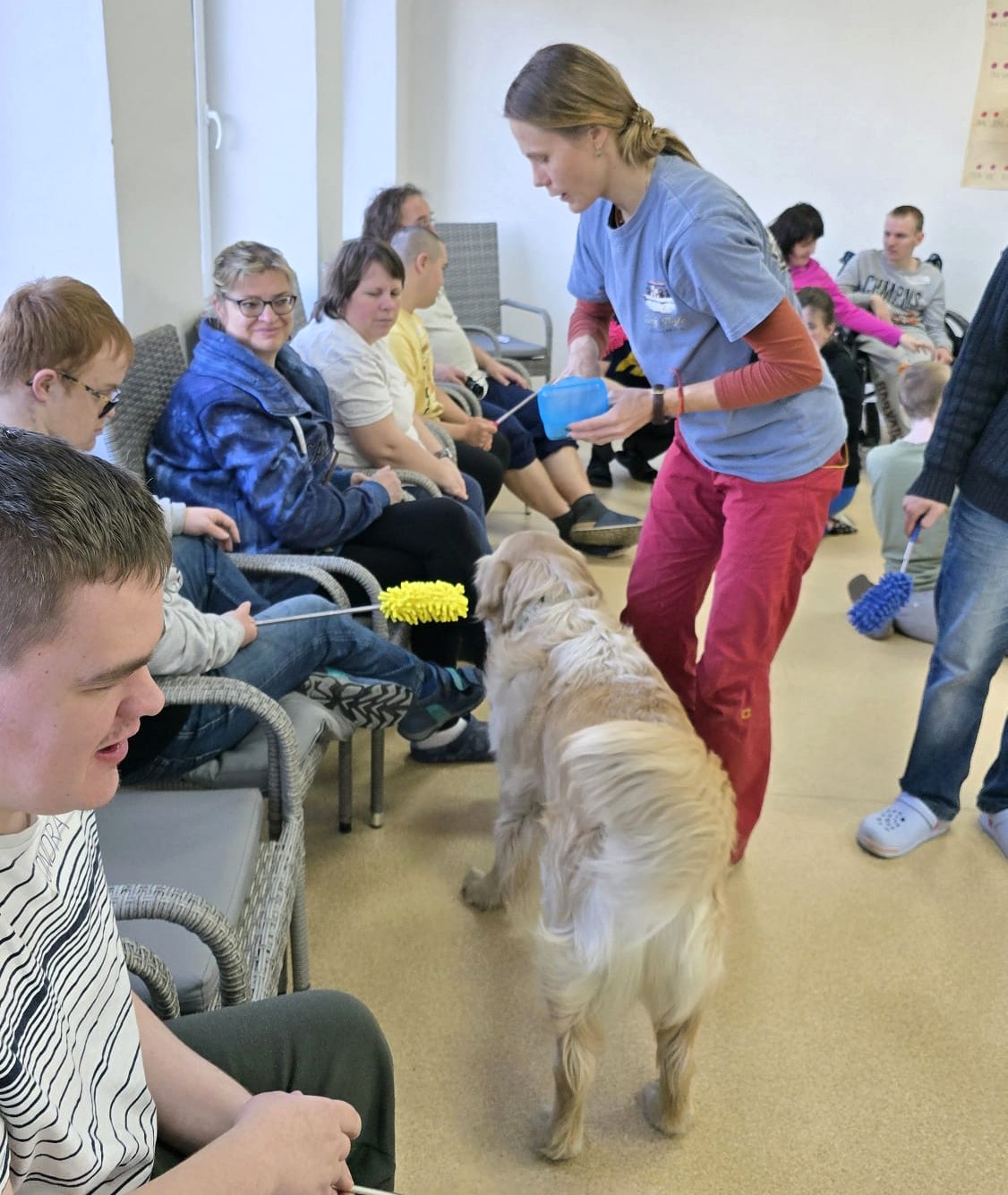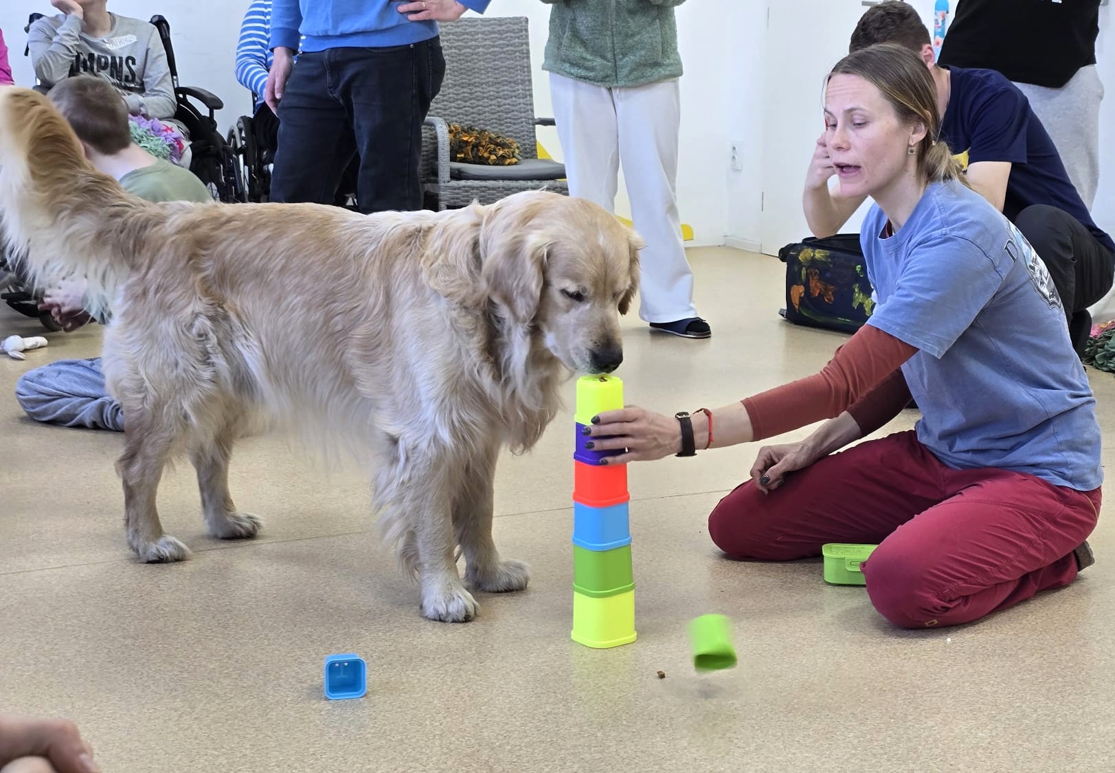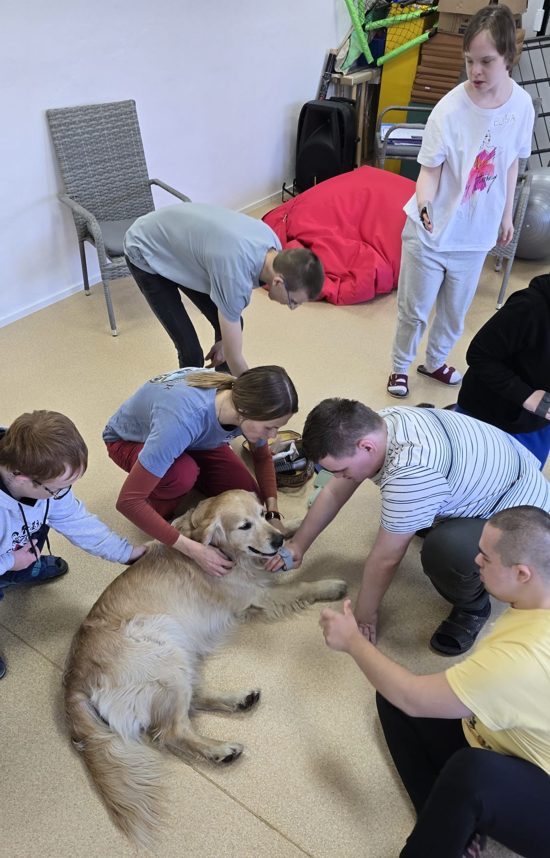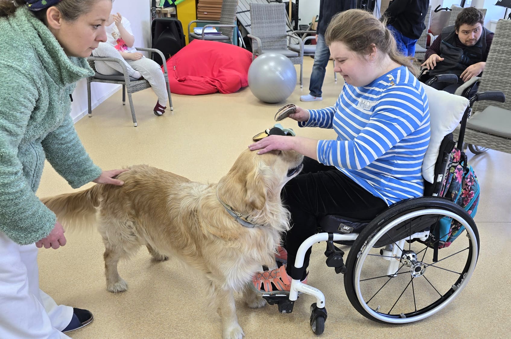 Začátkem dubna nás navštívil zlatý retrívr Eddie se svou paní canisterapeutkou. Canisterapie probíhala nejdříve v celé skupině, kde Eddie ukazoval, co dokáže – například to, jak umí najít pamlsek ve věži sestavené z kostek. Canisterapeutka s každým žákem poté pracovala individuálně dle žákových pohybových možností, a také podle toho, jaký má žák vztah k psům obecně. Pes Eddie nás všechny nadchl a už se těšíme na jeho další návštěvu .