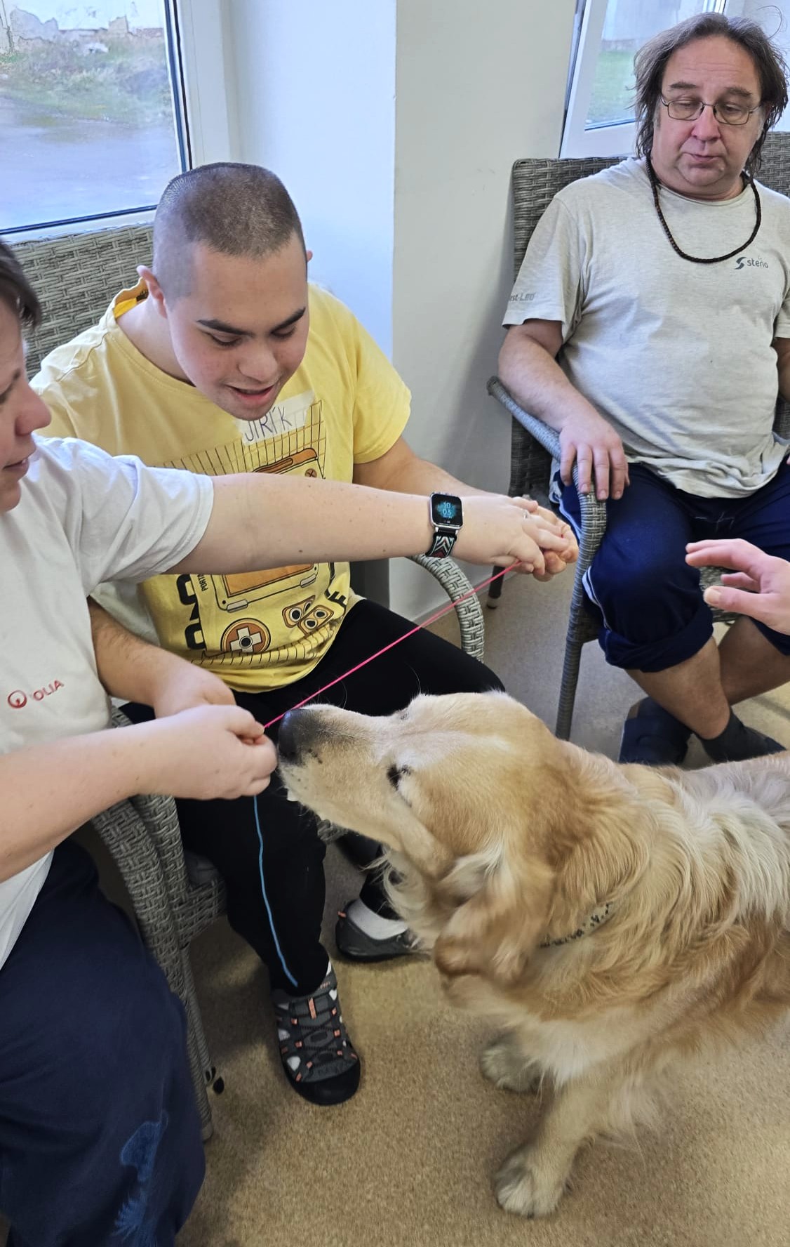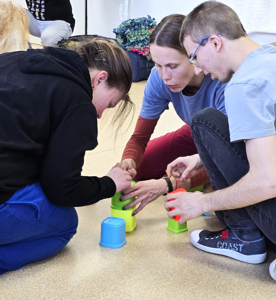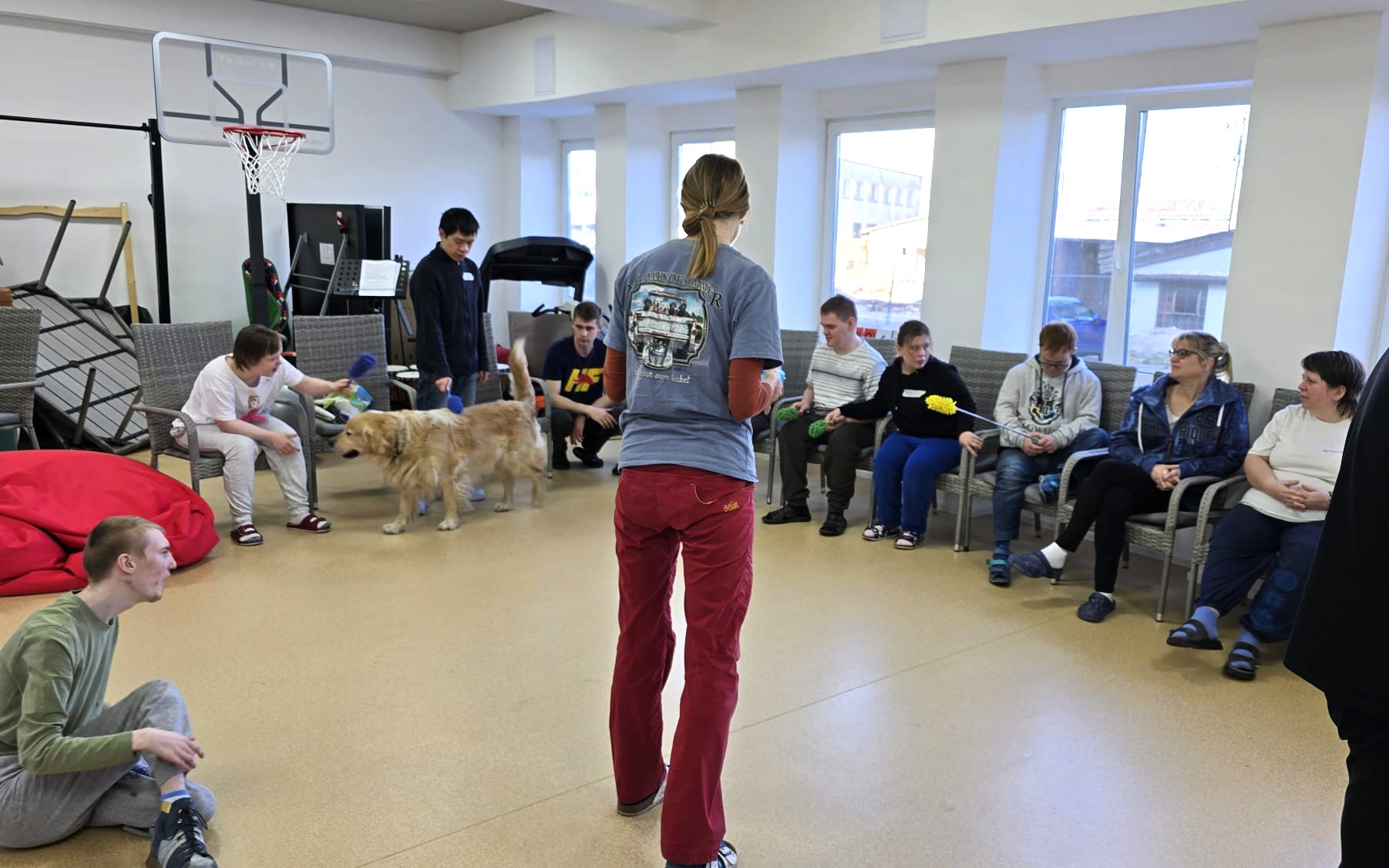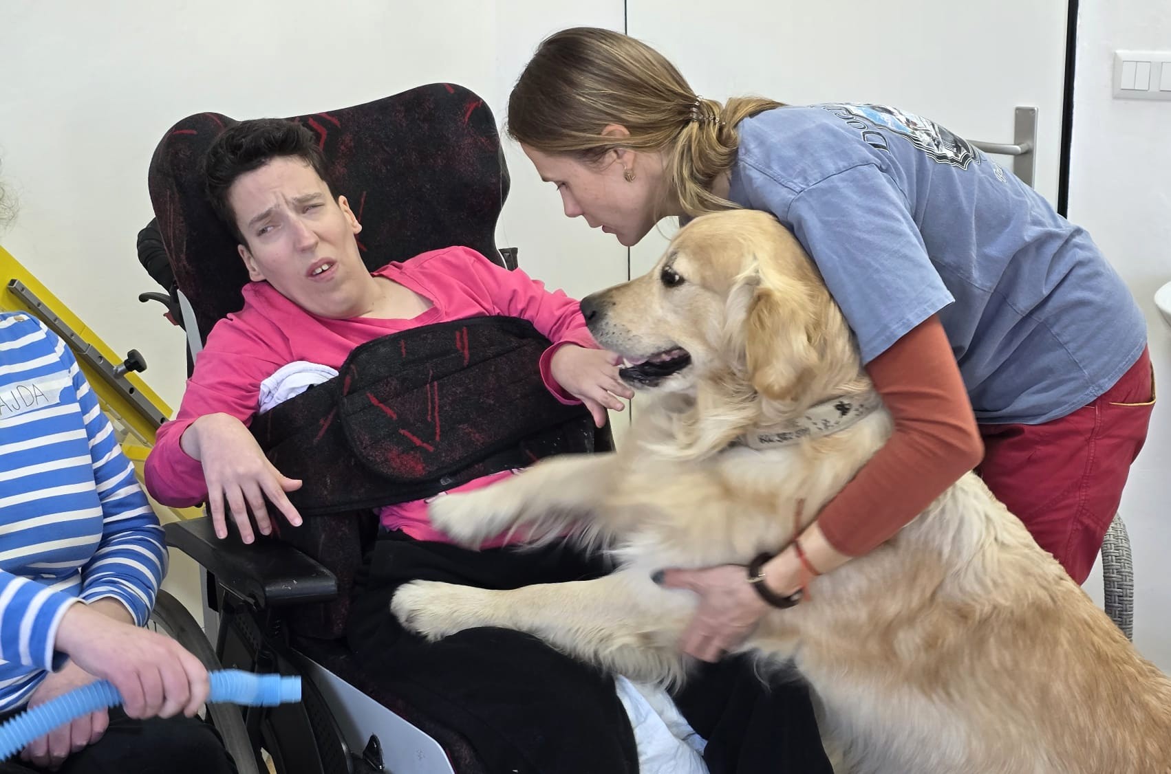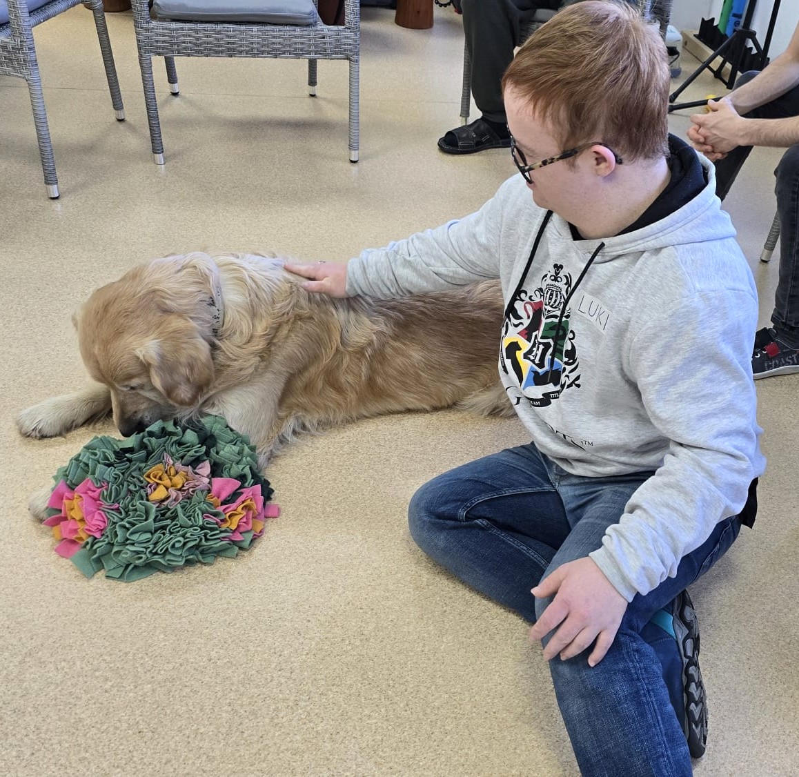 Začátkem dubna nás navštívil zlatý retrívr Eddie se svou paní canisterapeutkou. Canisterapie probíhala nejdříve v celé skupině, kde Eddie ukazoval, co dokáže – například to, jak umí najít pamlsek ve věži sestavené z kostek. Canisterapeutka s každým žákem poté pracovala individuálně dle žákových pohybových možností, a také podle toho, jaký má žák vztah k psům obecně. Pes Eddie nás všechny nadchl a už se těšíme na jeho další návštěvu .