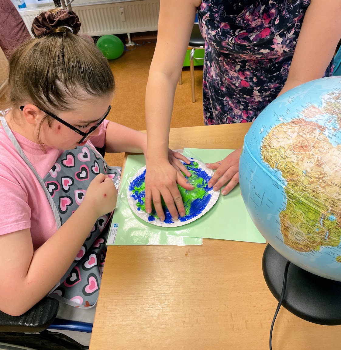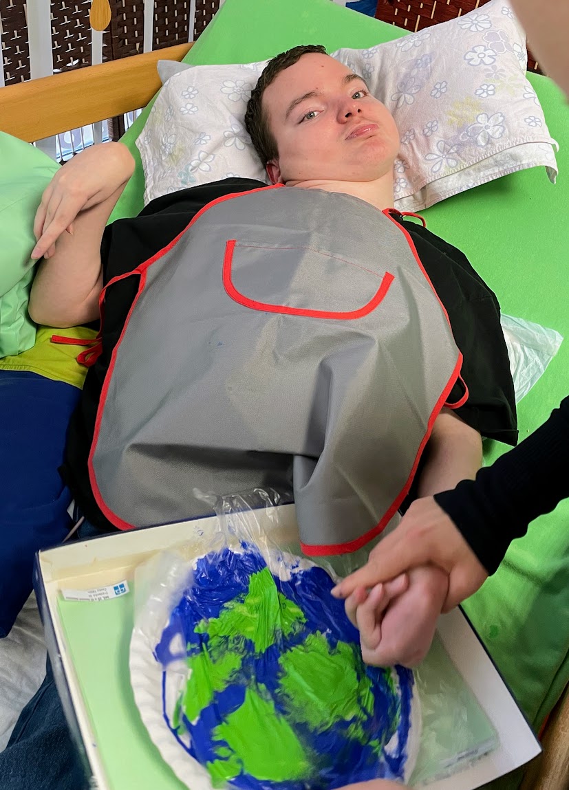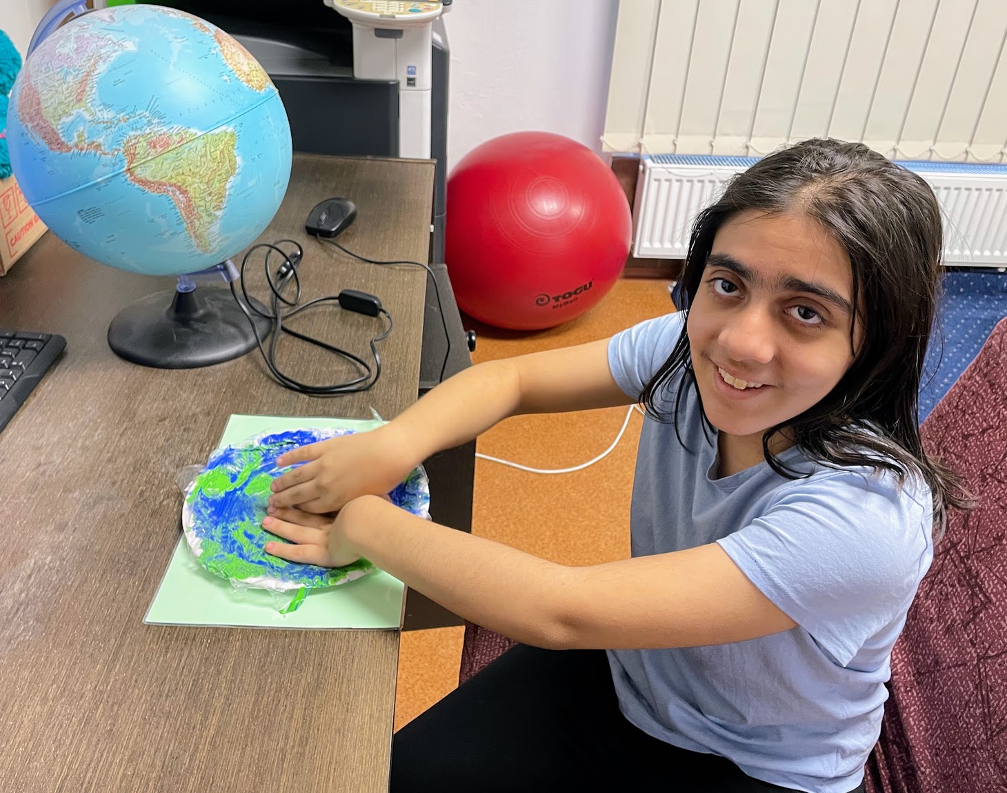 Také jsme si vytvořili Zeměkoule roztíráním temperových barev. Cítili jsme pod prsty rozšiřující se barvu a pozorovali, jak barvy pracují a jak se mísí, a těšili se na výsledek. Co myslíte, povedly se nám?