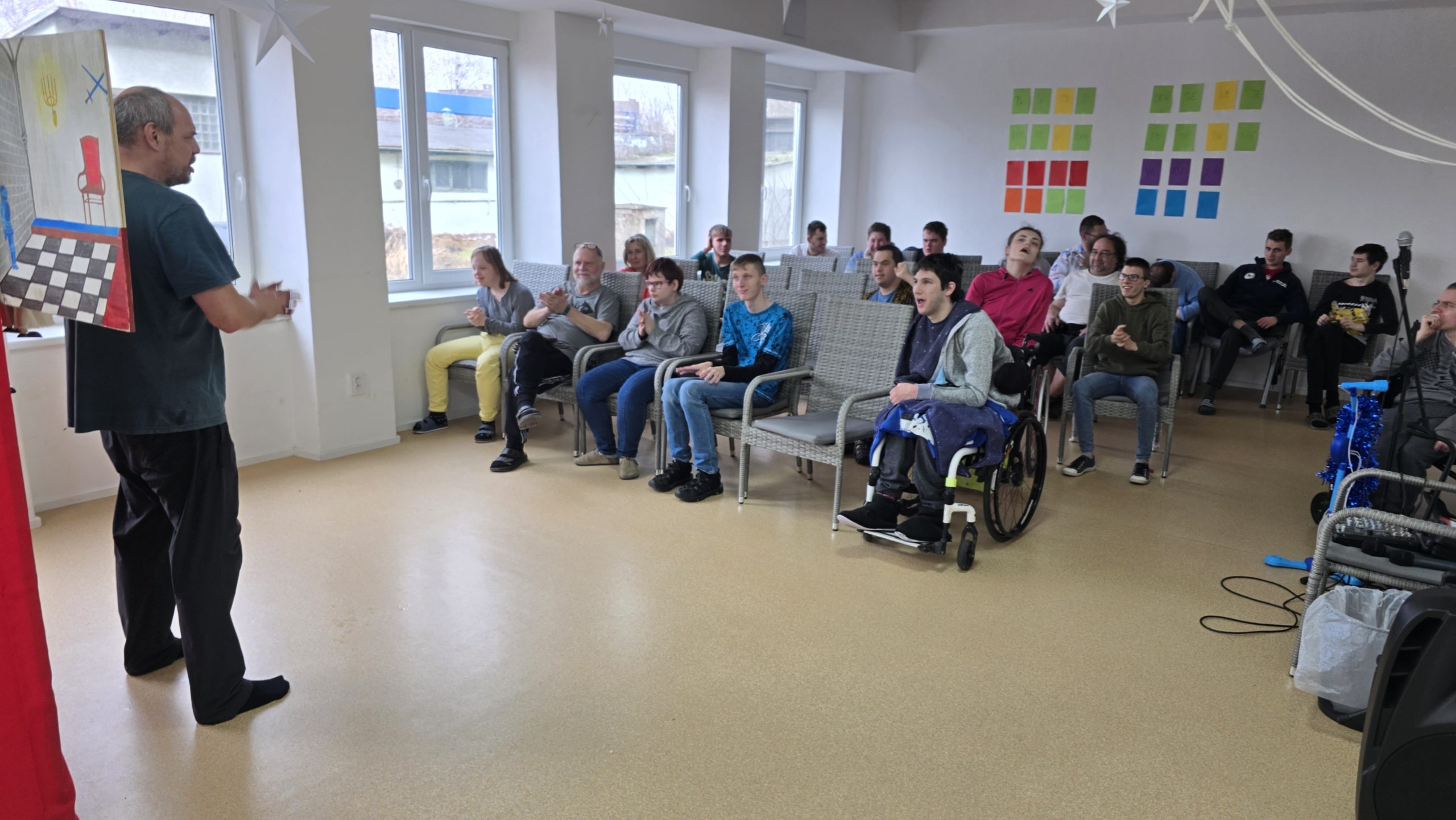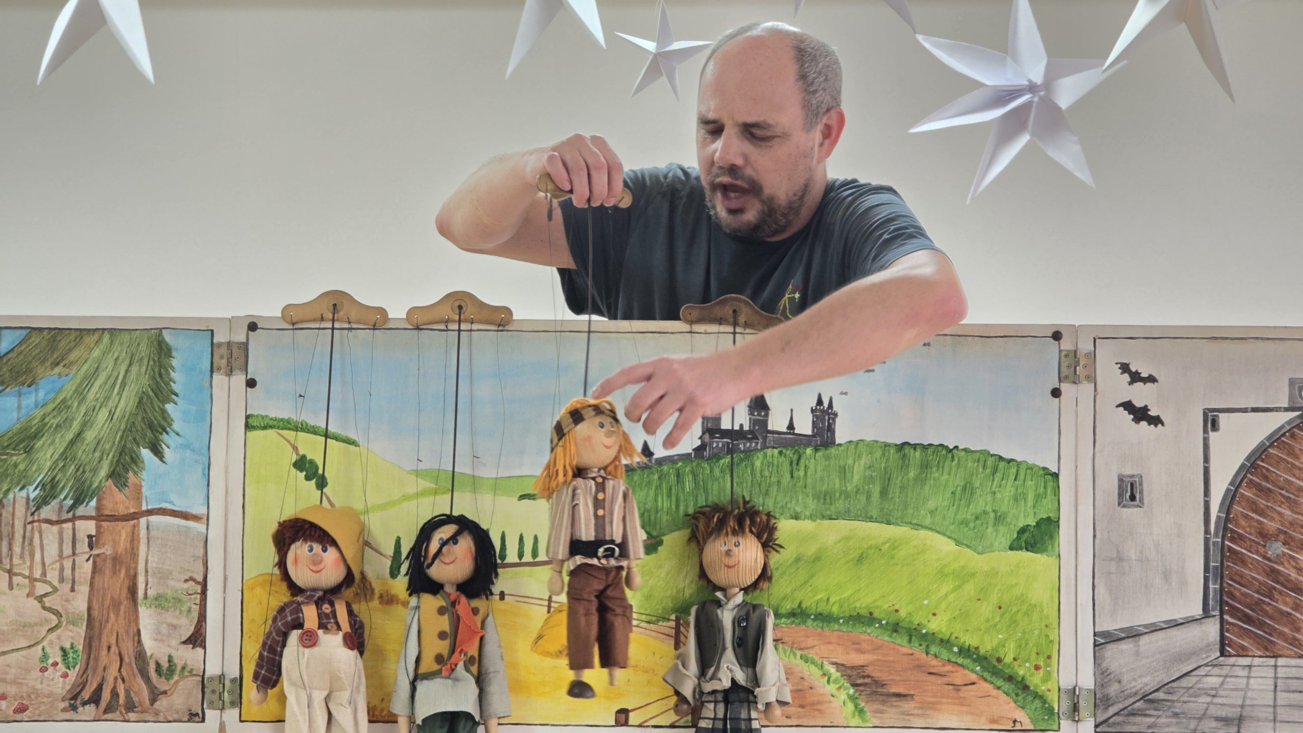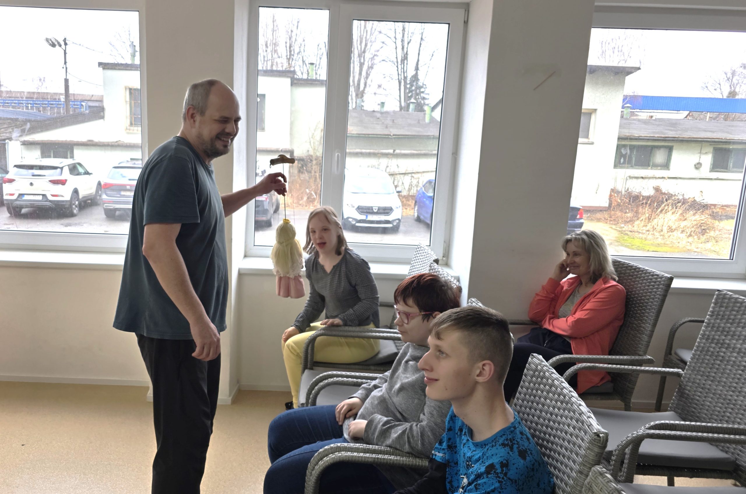 Toto loutkové divadlo bylo zajímavé tím, že hybatel loutek zároveň hrál a zpíval na kytaru písně k představované pohádce, takže hned na začátku představení si hrou a zpěvem získal naše žáky. Doslova je strhnul ke spontánnímu zpěvu veselých opakujících se melodií. Pak začala pohádka „Dlouhý, Široký a Bystrozraký“. Před našima očima se odehrával hezký pohádkový děj střídaný se zpěvem veselých písniček. Hýbatel loutek – pan Taraba čile komunikoval s našimi žáky a také dostával bohatou zpětnou vazbu na svoje otázky. Pohádka byla koncipována výchovně a měla žákům připomenout základní důležité principy slušného a přátelského chování. Všem se přestavení líbilo, žáci byli velmi komunikativní a spontánní ve svých reakcích na probíhající představení.