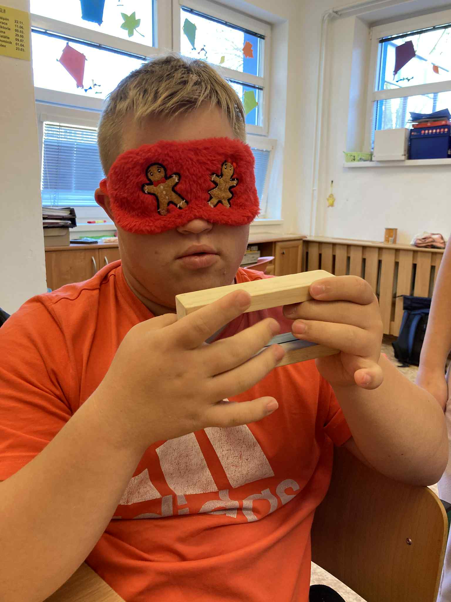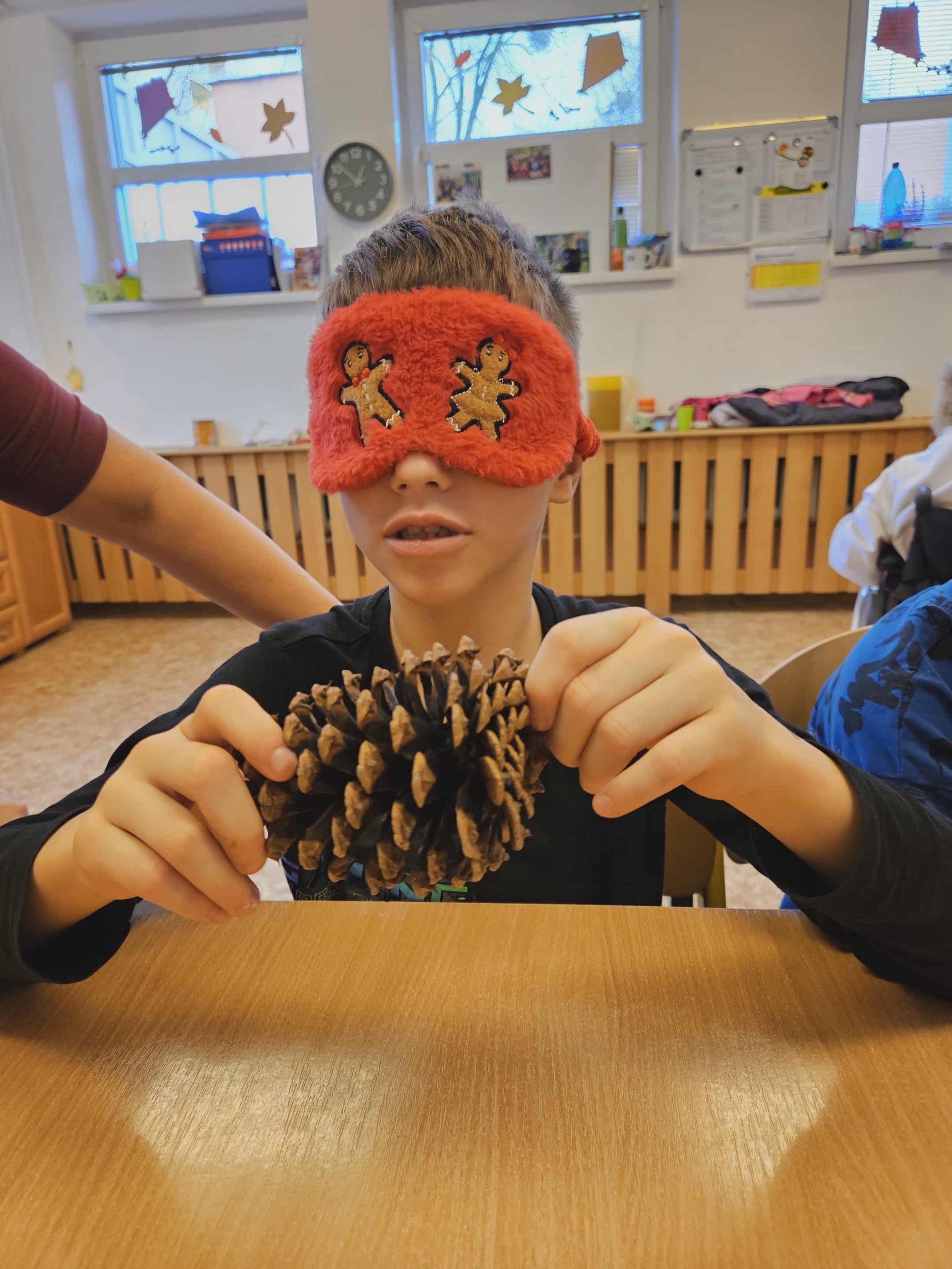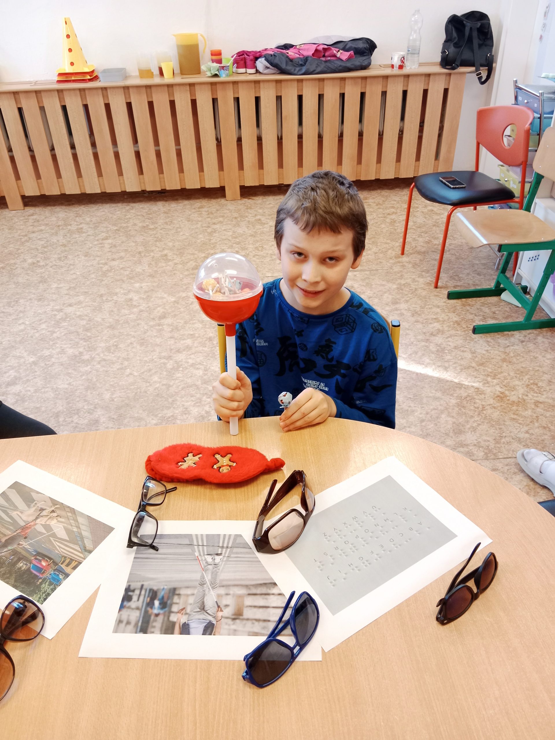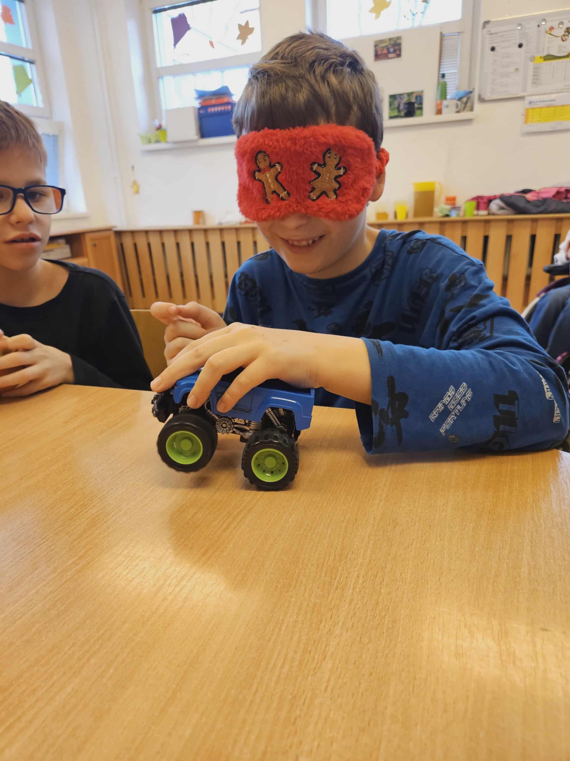 13. listopadu si celosvětově připomínáme den nevidomých a slabozrakých lidí. Ve školní družině jsme se rozhodli, že se pokusíme děti upozornit na každodenní problémy a potřeby nevidomých lidí. V místnosti senzorické integrace jsme si vytvořili jednoduchou překážkovou dráhu, kterou děti nejprve zdolaly běžným způsobem, avšak následně jim byl zrak zakryt škraboškou. Pedagogičtí pracovníci žáky navigovali a povzbuzovali. Po počátečním ostychu se děti osmělily a všechny se do aktivity krásně zapojily. Se škraboškou na očích žáci následně absolvovali disciplíny jako: házení obručí na trn, ochutnávku laskomin, poznávání zvuků dopravních prostředků a identifikaci různých předmětů a materiálů hmatem. Každý žák si mohl vyzkoušet dioptrické a sluneční brýle a ukázali jsme si, jak vypadají základní pomůcky nevidomých a to konkrétně lupu, slepeckou hůl, vodicího psa a Braillovo písmo. Na závěr žáci dostali za svou šikovnost lízátka.