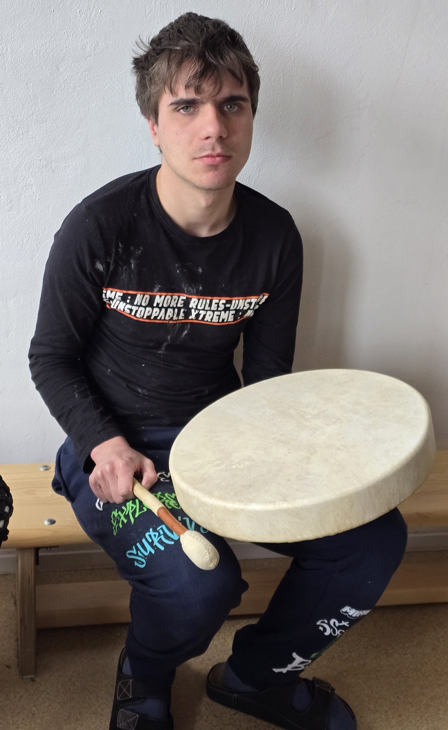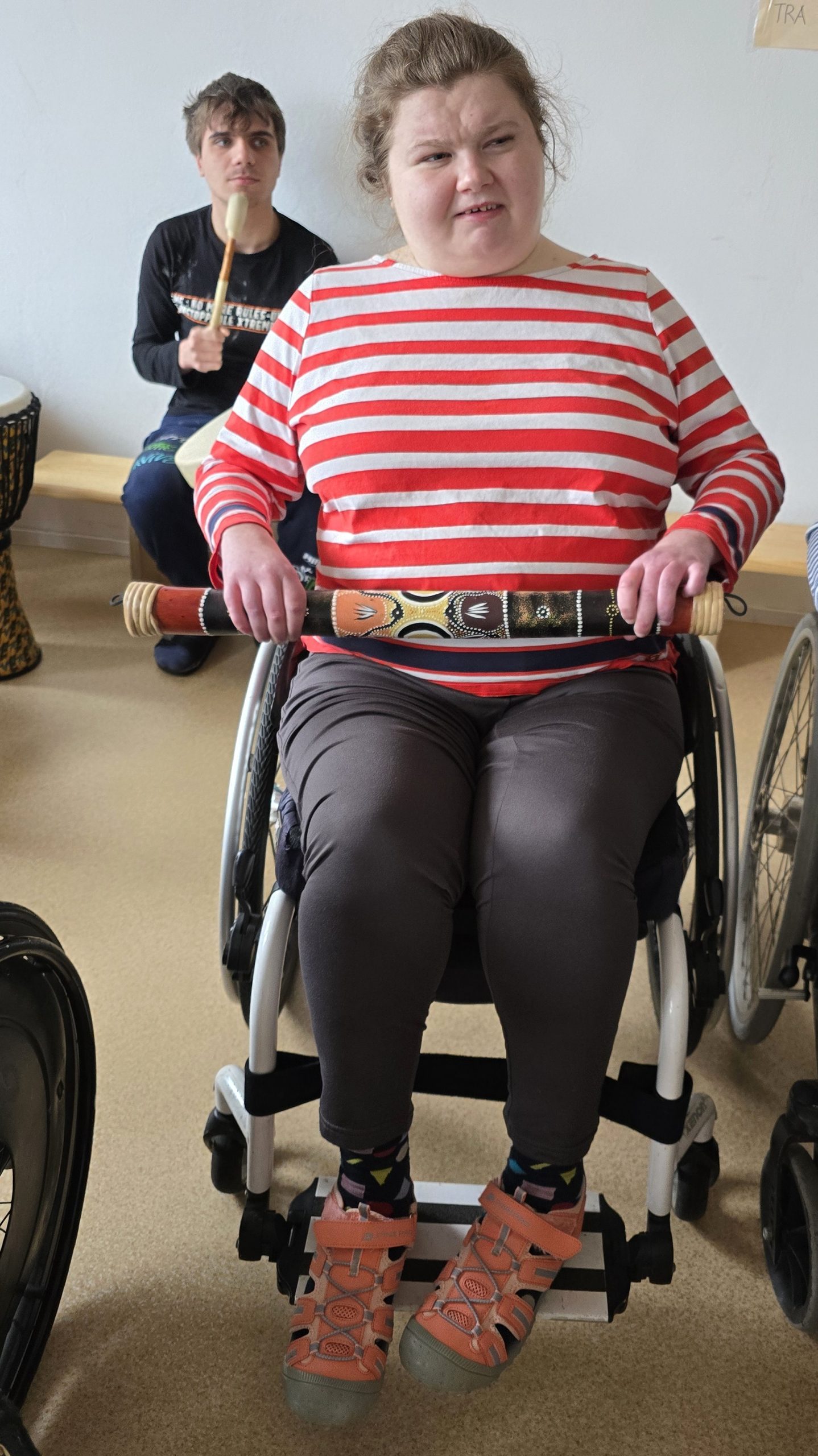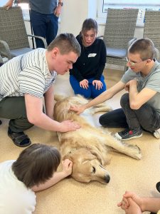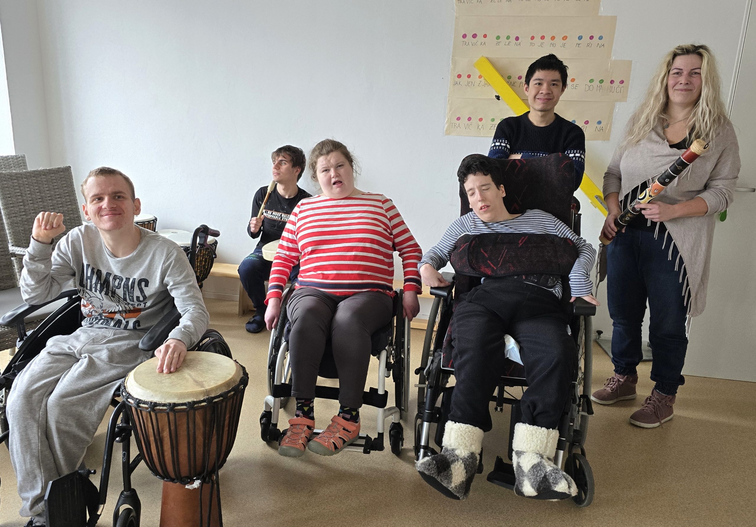 V březnu nám zavítala lektorka muzikoterapie v rámci hudebně prožitkového programu „Hudba s úsměvem“. Paní lektorka si usadila naše žáky v půlkruhu v tělocvičně, rozdala rytmické nástroje různého druhu, převážně Orfova instrumentáře. Na rozehřátí doprovodili žáci píseň J. Nohavici „Kozel“. Pak lektorka interpretovala tuto píseň sama za doprovodu své kytary a perkusí žáků. Dalším úkolem k procvičení imaginace bylo hudebně ztvárnit příchod zvěře k napajedlu u řeky v lese. Žáci invenčně použili rozdané perkuse včetně dřevěného žáby, deštné díry a štěrkadla vyrobeného ze slupek ořechů. Žáci i žákyně byli 45 minutovým programem nadšeni a přejí si opakování.