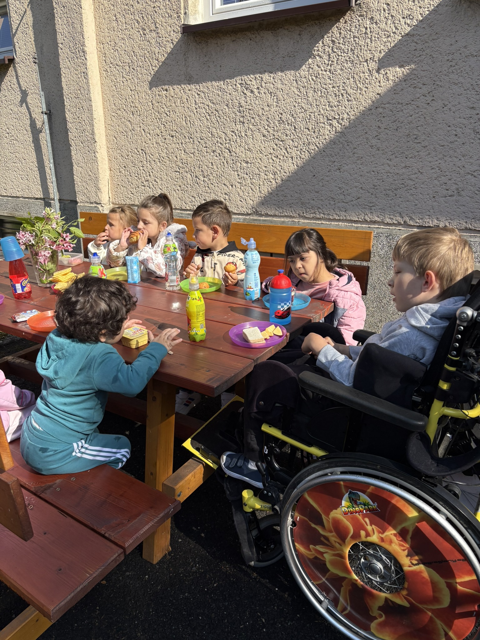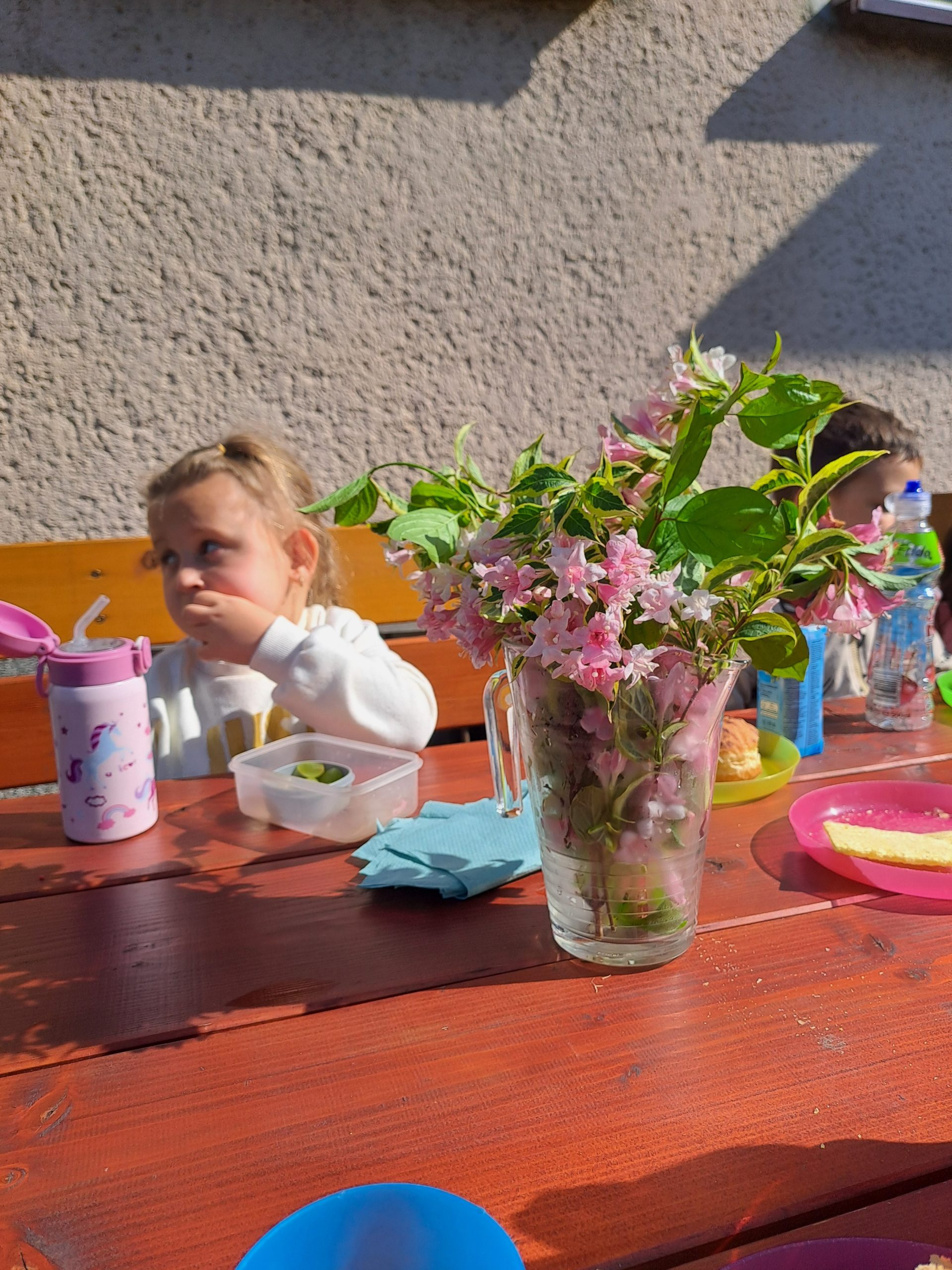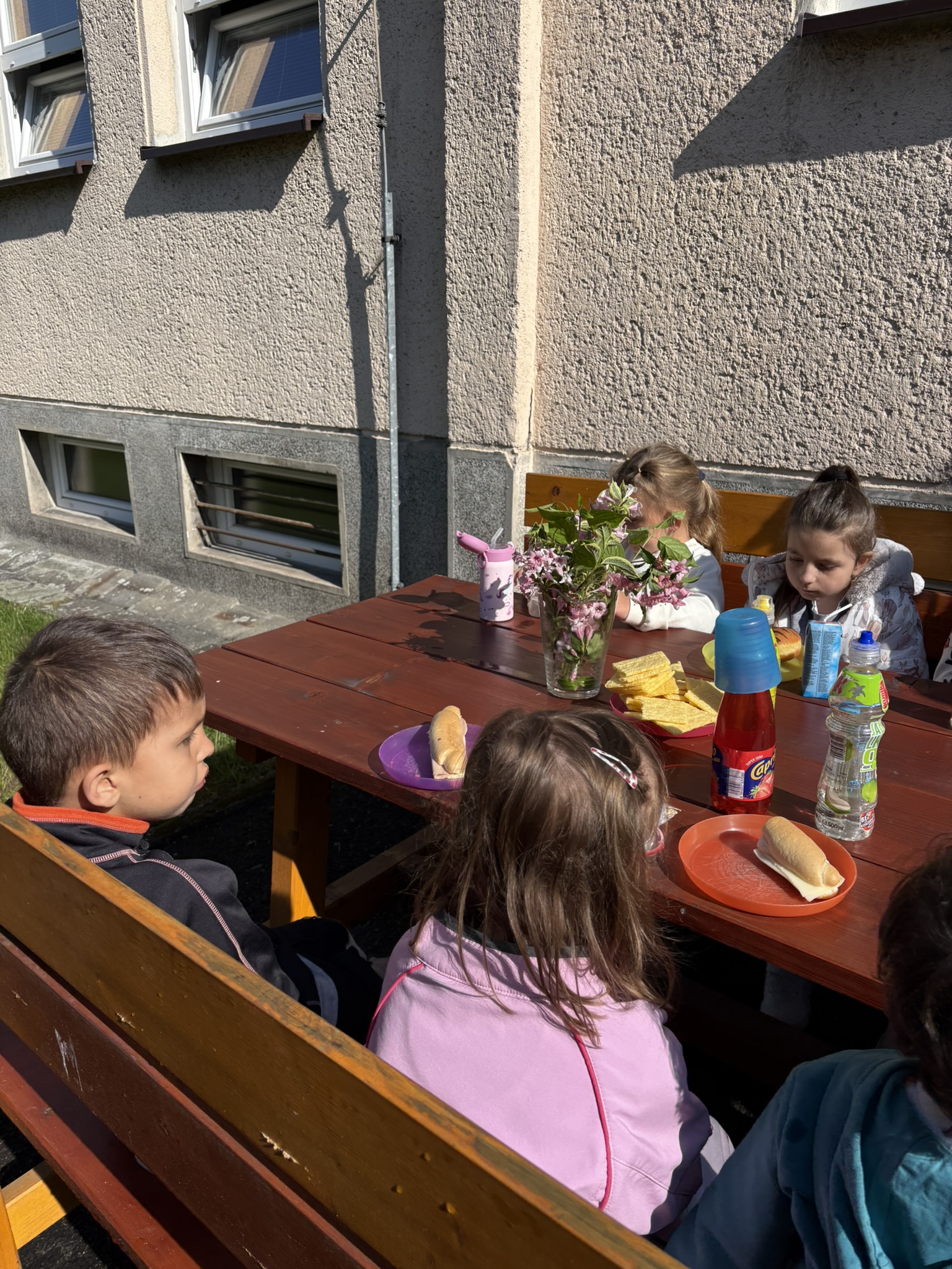 Během posledního květnového týdne se konečně vyčasilo a sluníčko nám na zahradu svítilo už od brzkého rána. Takového krásného počasí jsme hned museli využít a rozhodli se uspořádat si pohoštění na zahradě. Na stůl jsme si donesli svačinky z domovů i různé mňamky, nachystali si do vázy květinovou výzdobu a užili si krásné dopoledne venku.