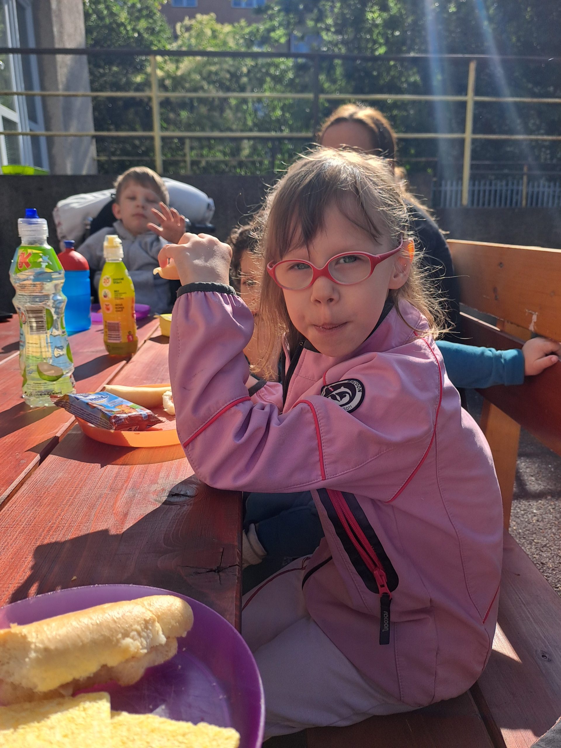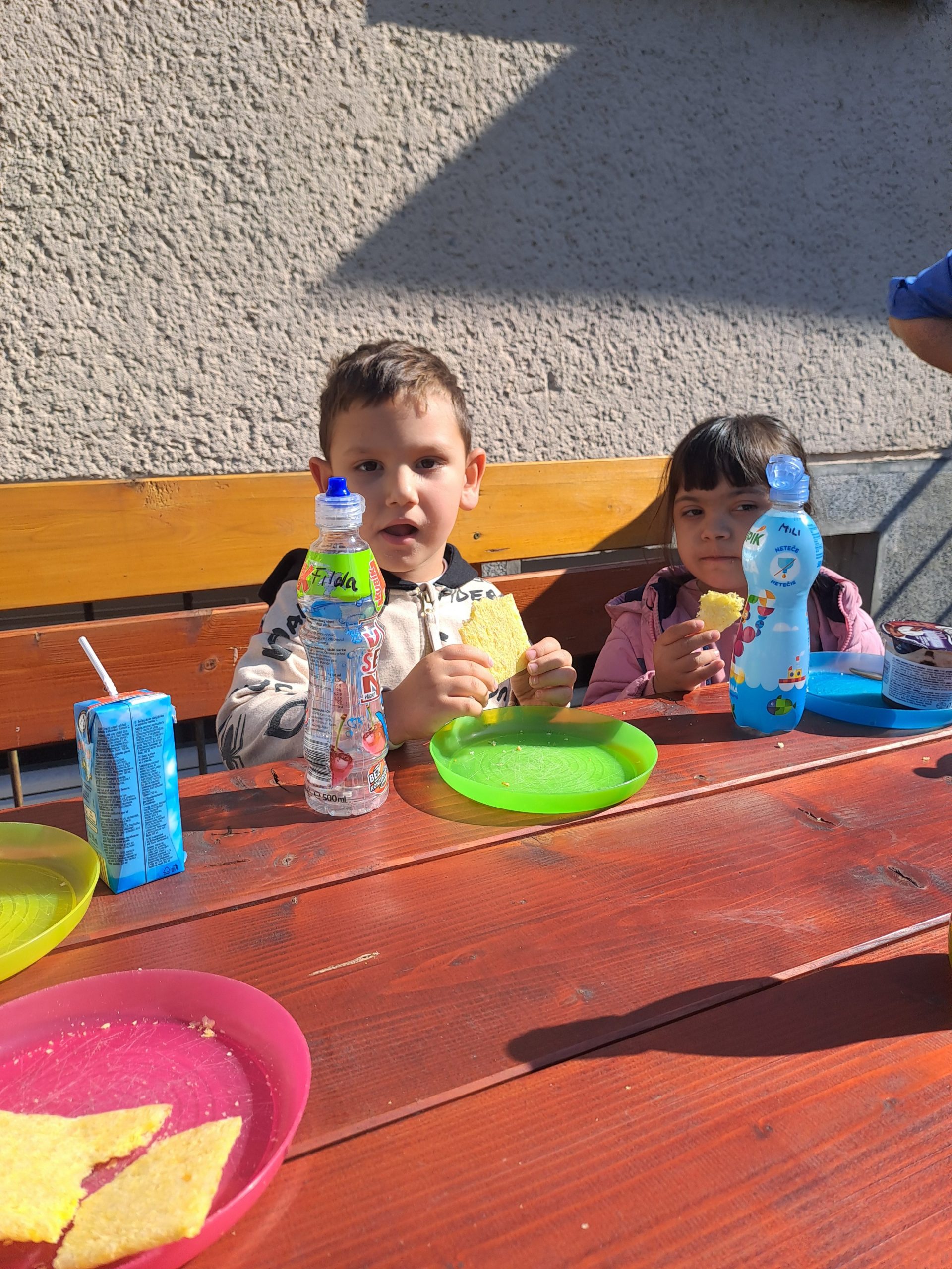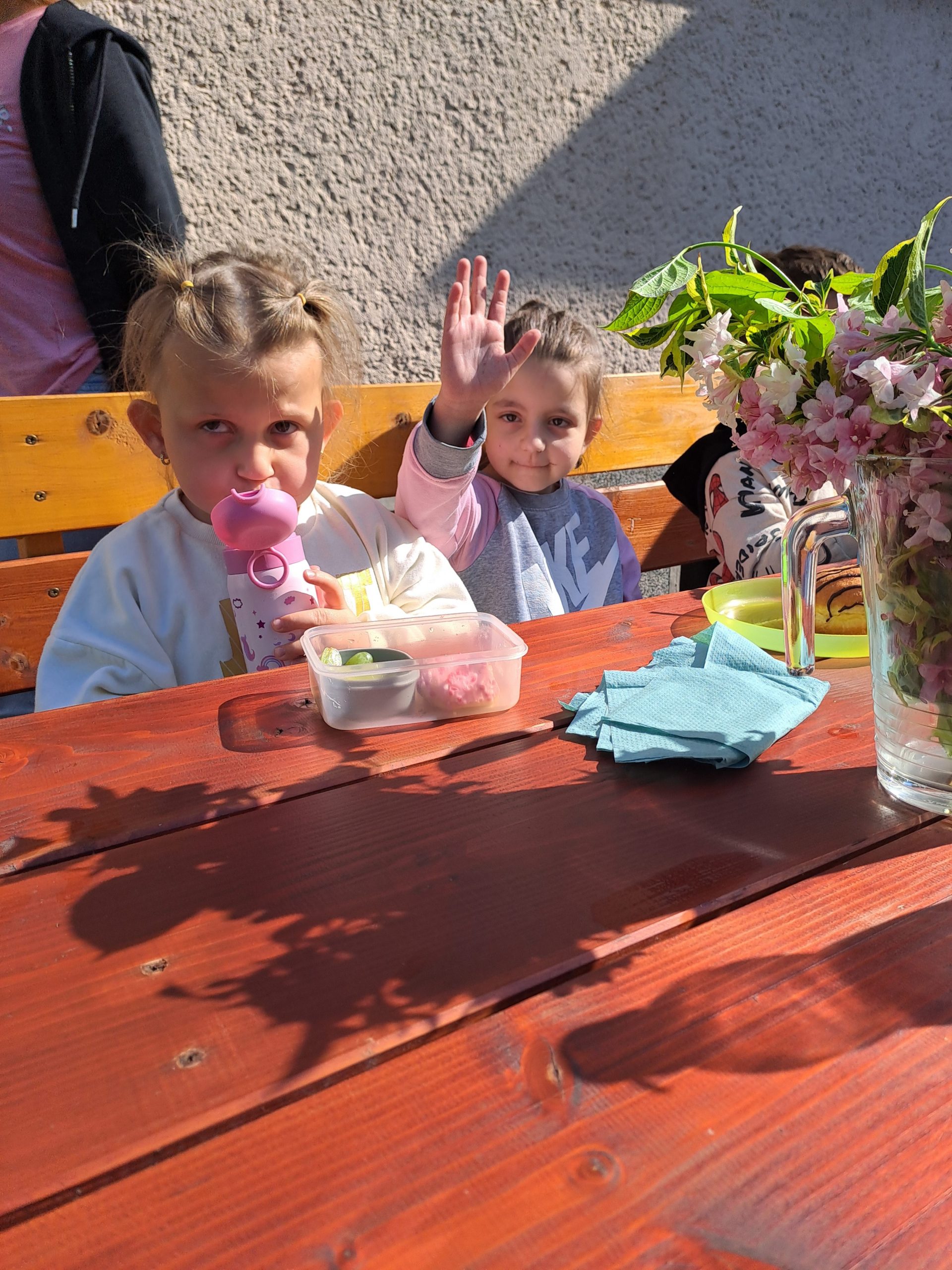 Během posledního květnového týdne se konečně vyčasilo a sluníčko nám na zahradu svítilo už od brzkého rána. Takového krásného počasí jsme hned museli využít a rozhodli se uspořádat si pohoštění na zahradě. Na stůl jsme si donesli svačinky z domovů i různé mňamky, nachystali si do vázy květinovou výzdobu a užili si krásné dopoledne venku.
