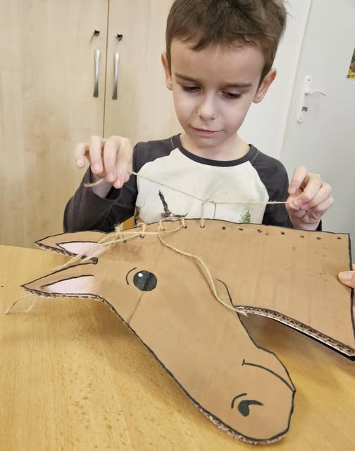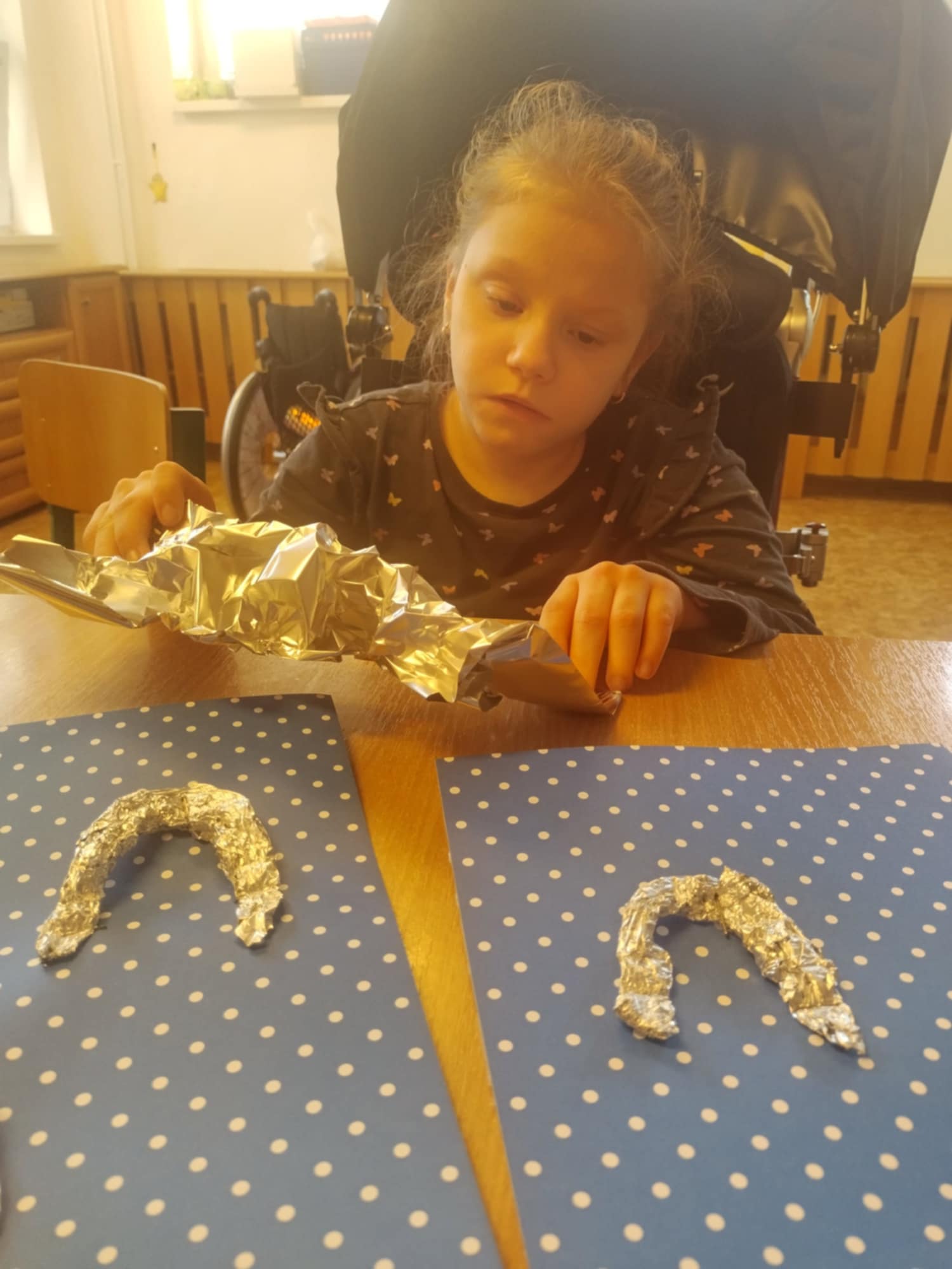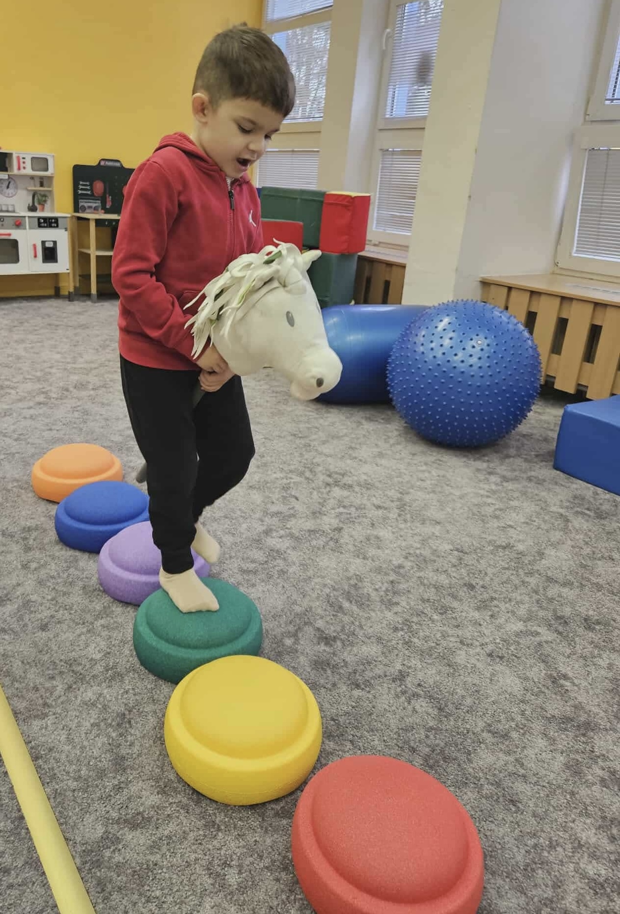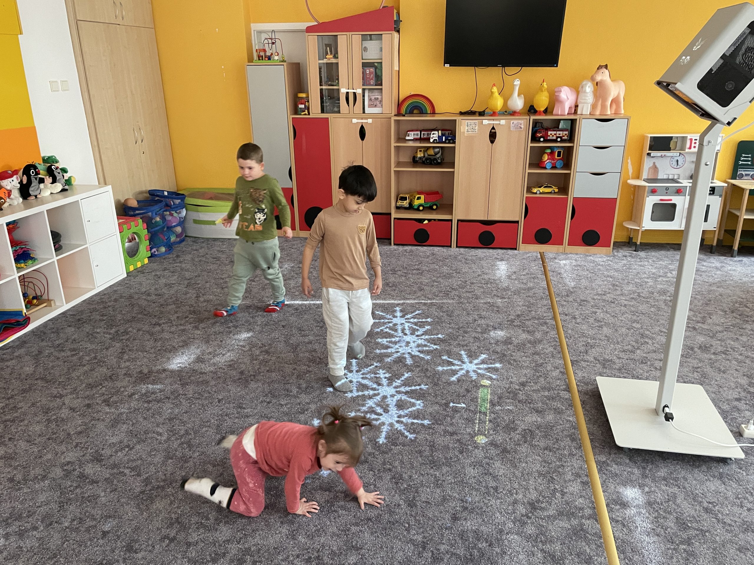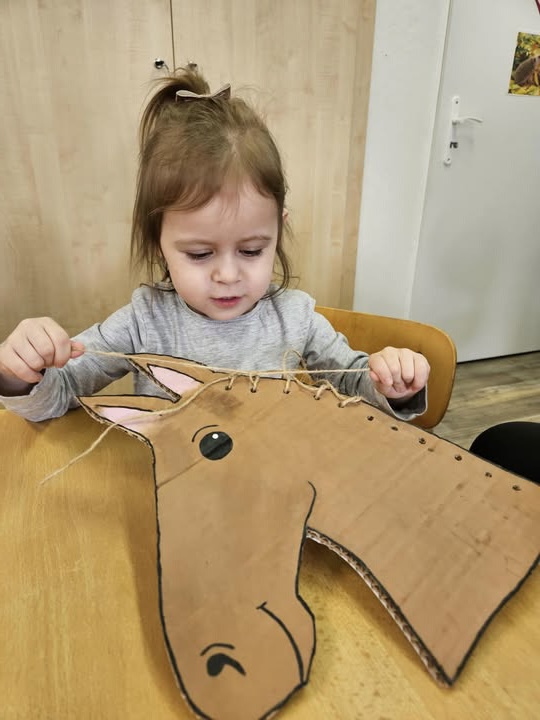 Děti a žáci si užily týden různých činností k tématu Sv. Martin. Nejprve jsme si pověděli o tom, kdo Svatý Martin byl, o křesťanské legendě, která říkaá , že se rozdělil se žebrákem o svůj plášť. Hezké povídání o něm měl pro nás připraveno také pan farář na své návštěvě naší pobočky. Děti se dozvěděly, co znamená, že Martin přijede na bílém koni, proč se peče svatomartinská husa, aj. Výtvarně jsme si Sv. Martina ztvárnili, procvičili grafomotoriku, na pracovním listu děti hledaly správné stíny k obrázkům, prstovou barvou vybarvovaly tělo husy, dokonce i plyšová husa málem skončila v troubě dětské kuchyňky :). Na vyrobených koňských hlavách si děti trénovaly jemnou motoriku – stříhání a vázání uzlíků na hřívě. Společně jsme si upekli svatomartinské rohlíčky – moc nám chutnaly. V rámci logopedických cvičení jsme foukali do peříček z opravdické domácí husičky. Vyrobili jsme si podkovy z alobalu a ozdobili je papírovými sněhovými vločkami – Martin na bílém koni totiž už po několikáté nepřijel. K pohybovým aktivitám jsme pro děti připravily překážkovou dráhu a využili jsme aktivní promítací plochu projektoru Fly Sky, na které jsou pohybující se sněhové vločky – děti po nich mohou šlapat a skákat. Vše bylo moc prima!