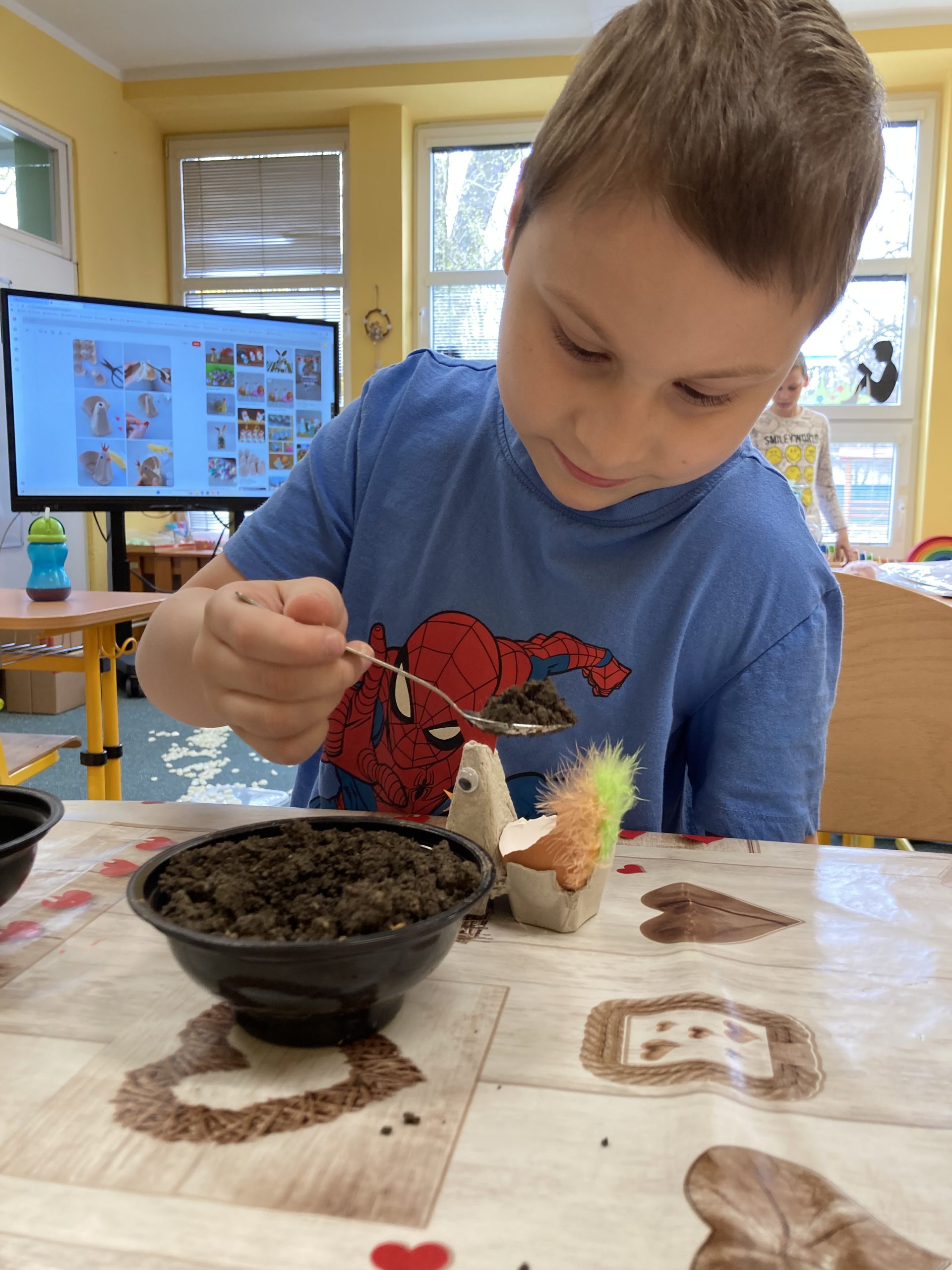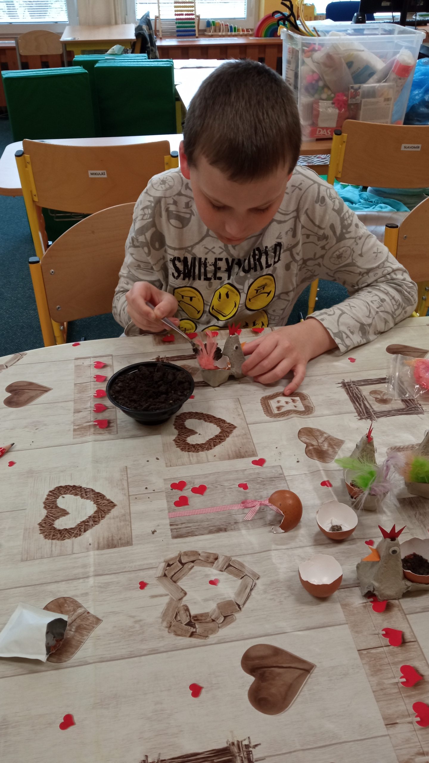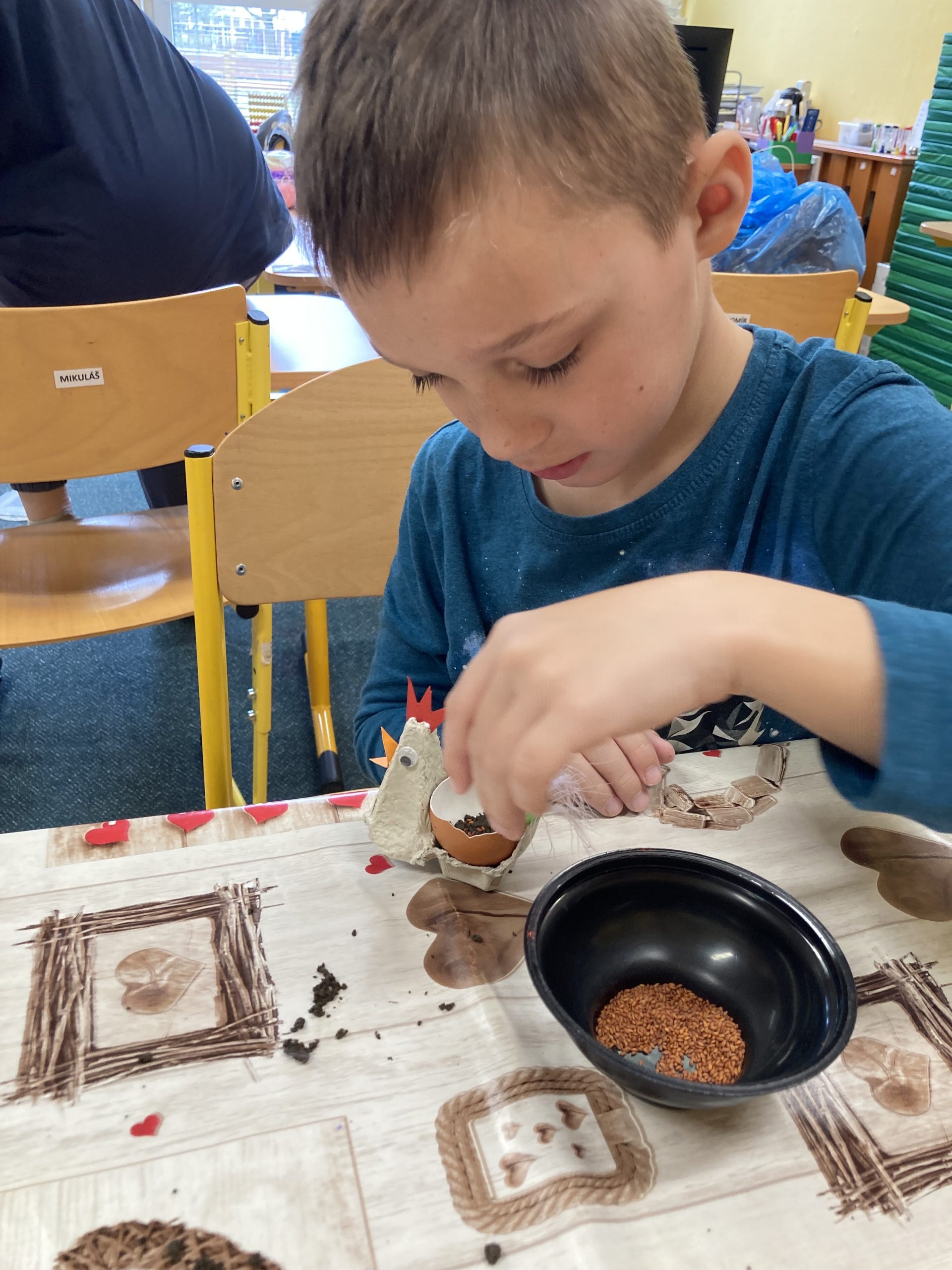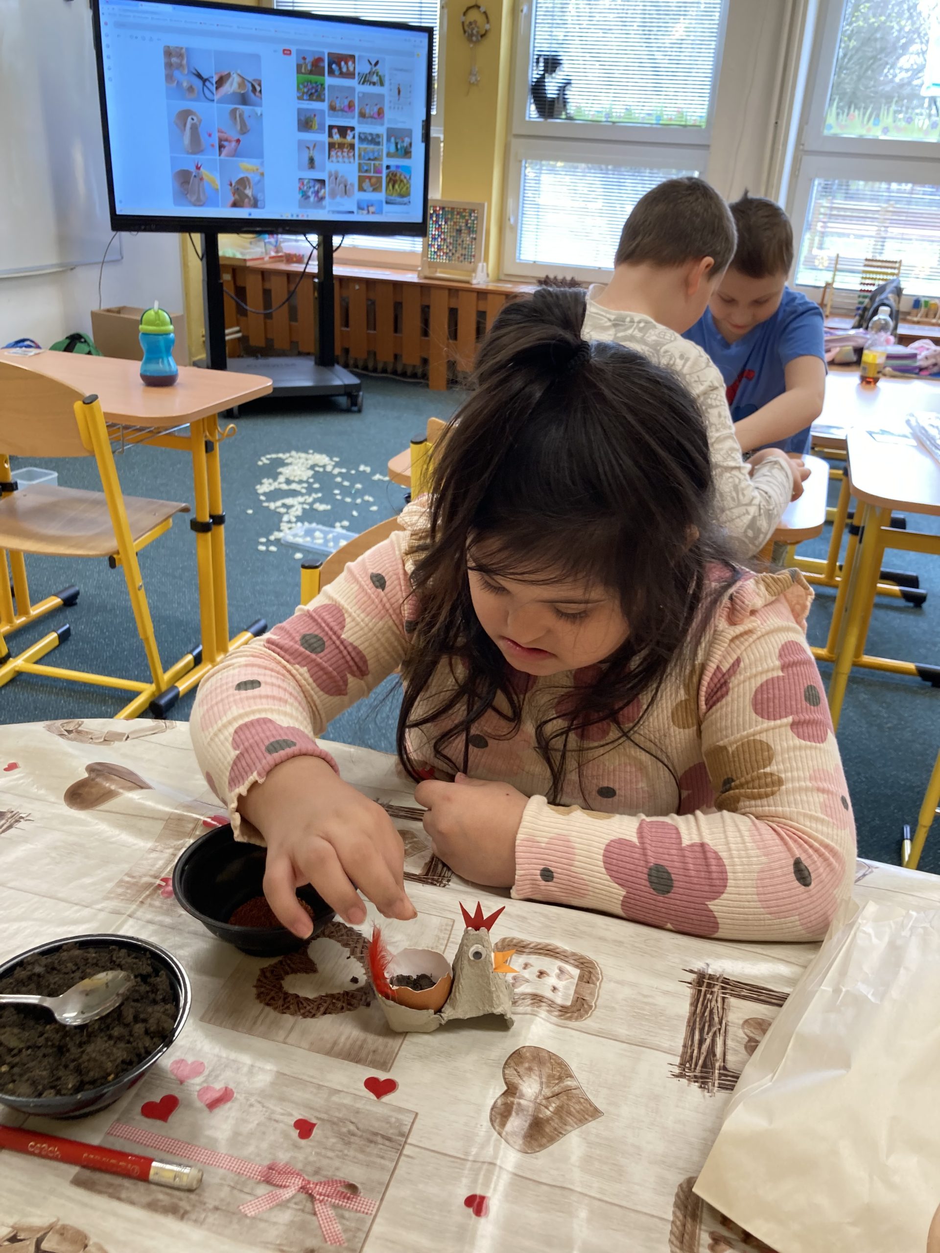 Žáci ZŠ X v Novém Bohumíně se, stejně jako ostatní, těšili na Velikonoce a připravovali také výzdobu a dekorace. Z plata od vajec vyrobili například slepičky, do kterých pak ve skořápkách zaseli řeřichu. Mohli si je pak vzít domů a vyzdobit si třeba svůj pokoj.