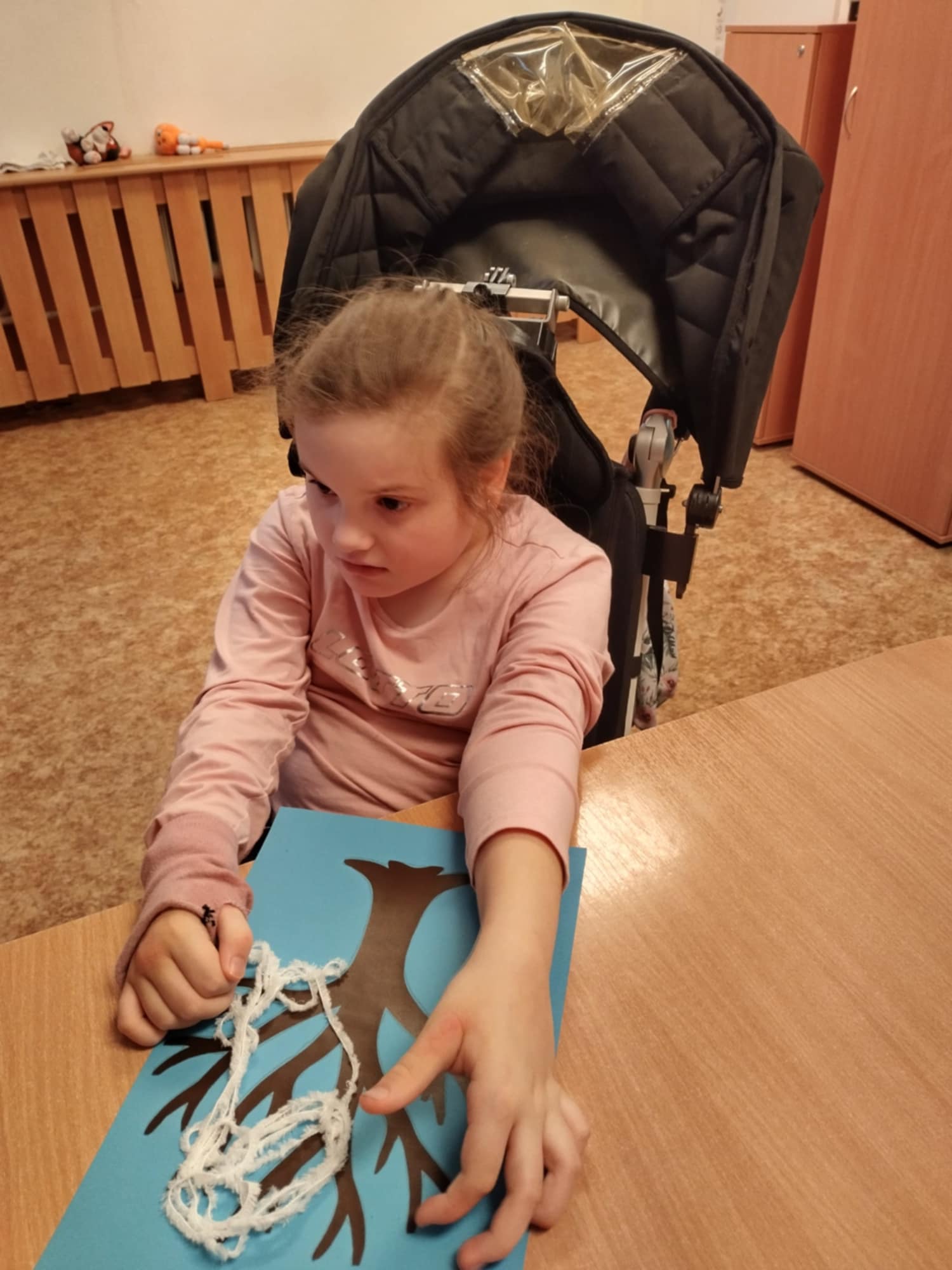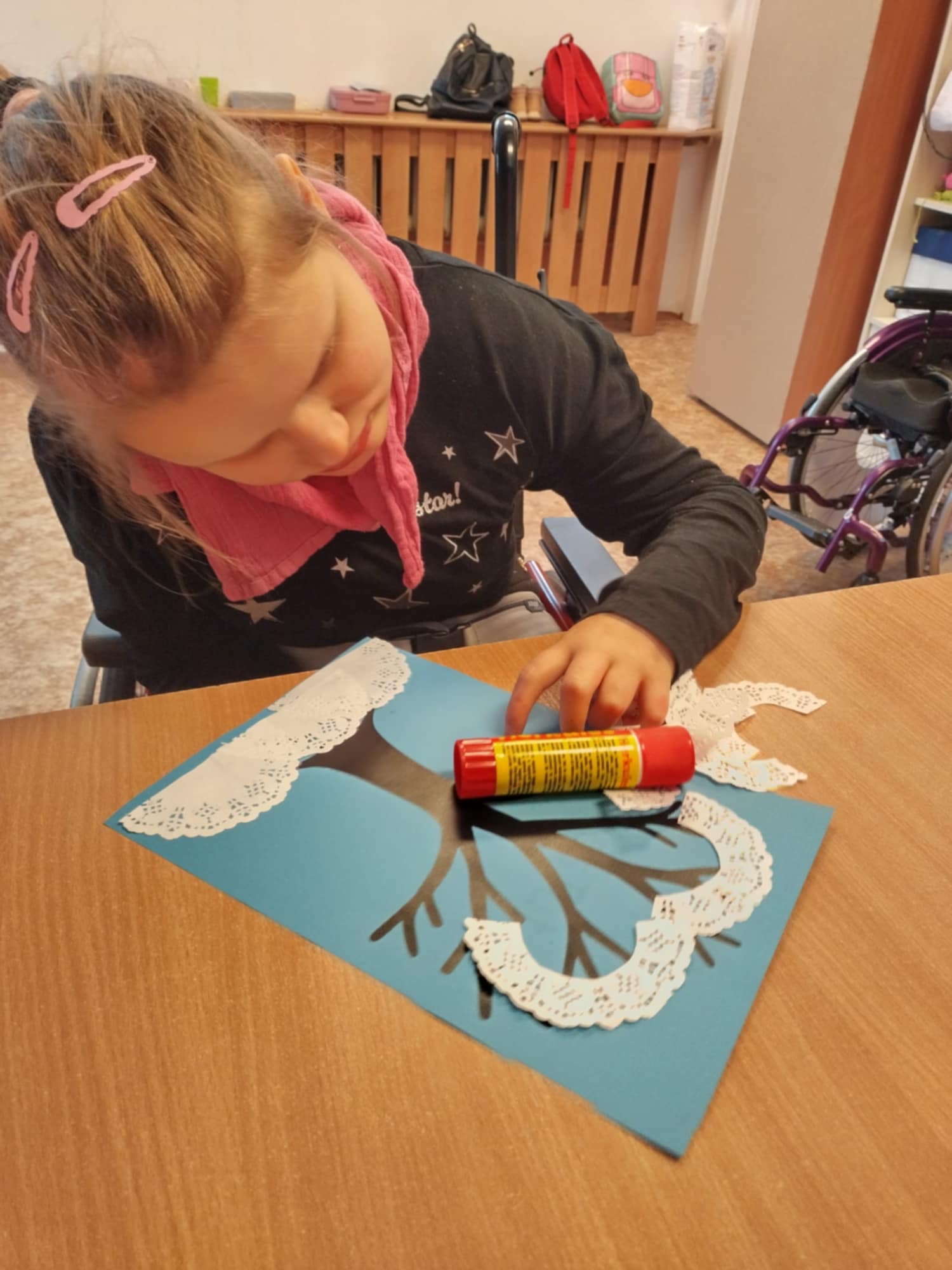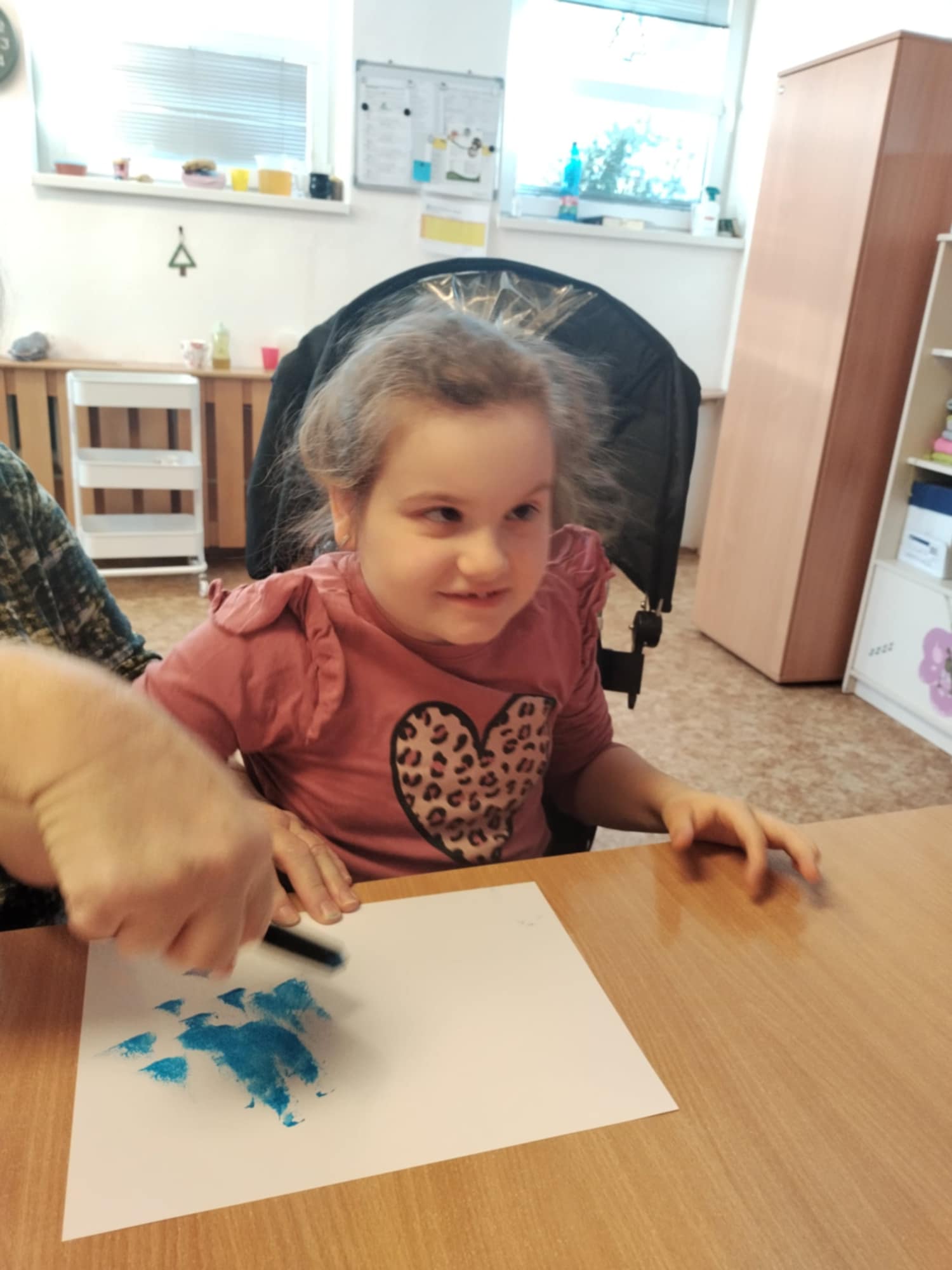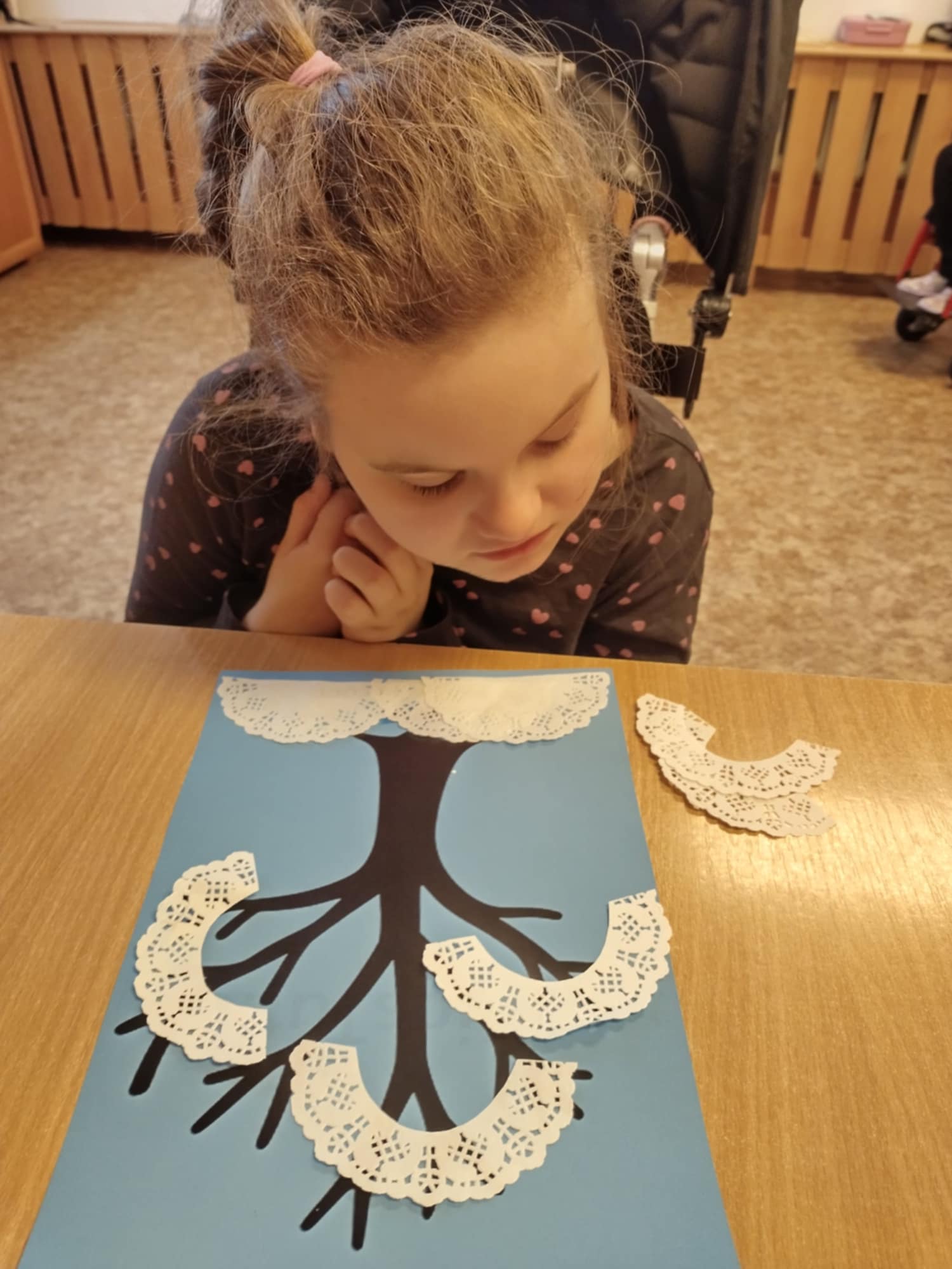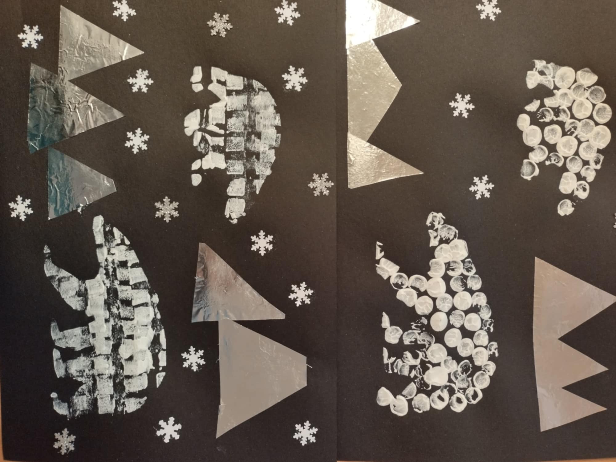 V hodinách výtvarné výchovy se žáci věnovali jednoduchým, ale velmi efektním činnostem inspirovaným zimou. S podporou asistentů pedagoga si vyzkoušeli různé techniky, které jim umožnily zachytit zimní atmosféru hravou a tvořivou formou. Žáci malovali polární záři pomocí stěrky na okna, vytvářeli zimní motivy houbičkami, k tvorbě zasněžených stromů využili bílou vlnu a pomocí raznic vyráběli sněhové vločky. Velkou radost jim udělalo také otiskování bublinkové fólie, které dodalo obrázkům zajímavou strukturu.