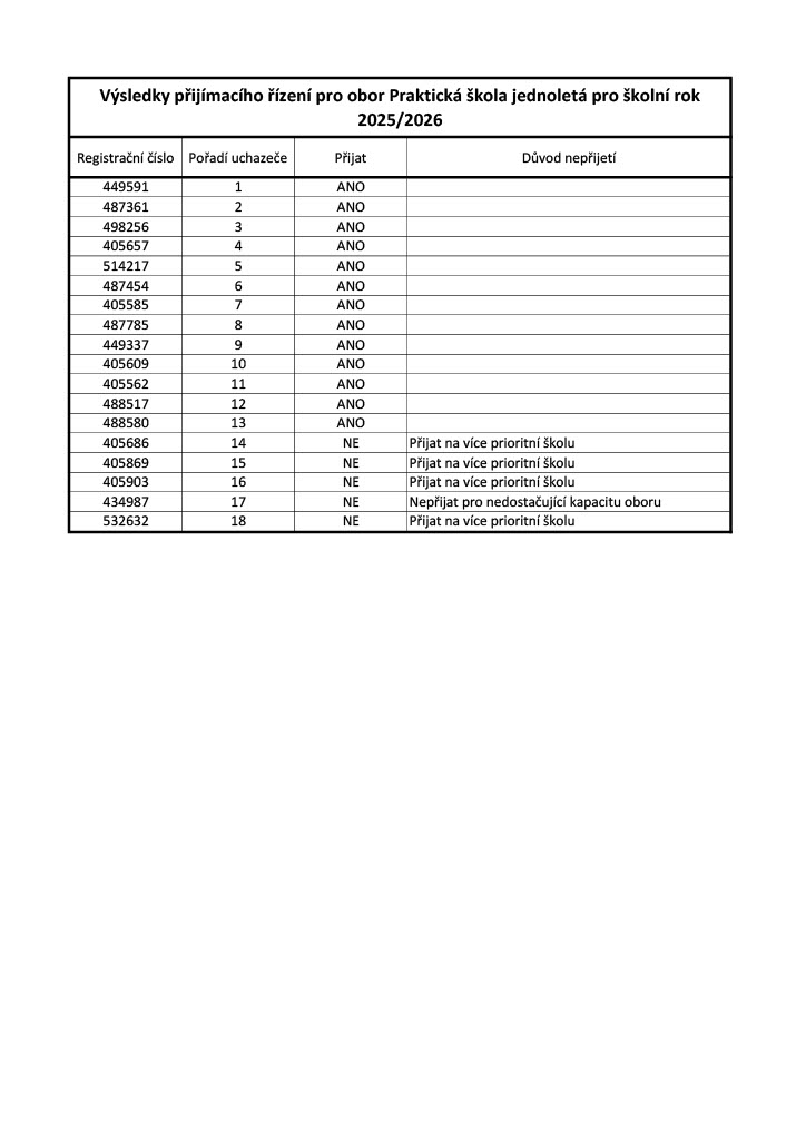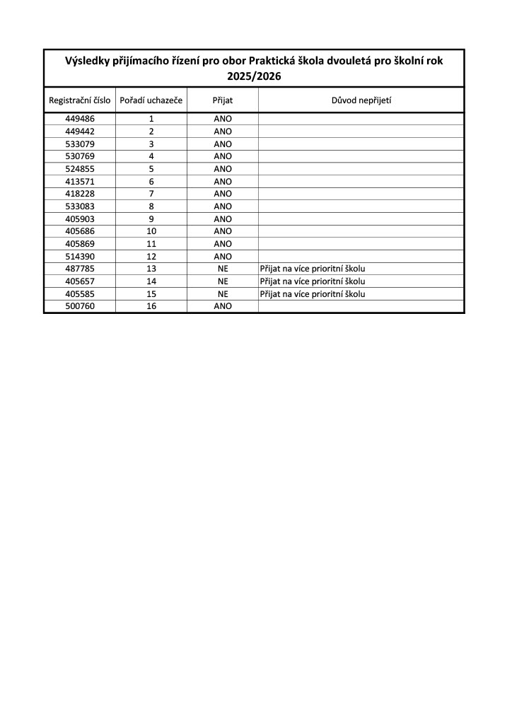 Přijímací řízení do Praktické školy jednoleté 78-62-C/01 a Praktické školy dvouleté 78-62-C/02 pro školní rok 2025/2026 VÝSLEDKY