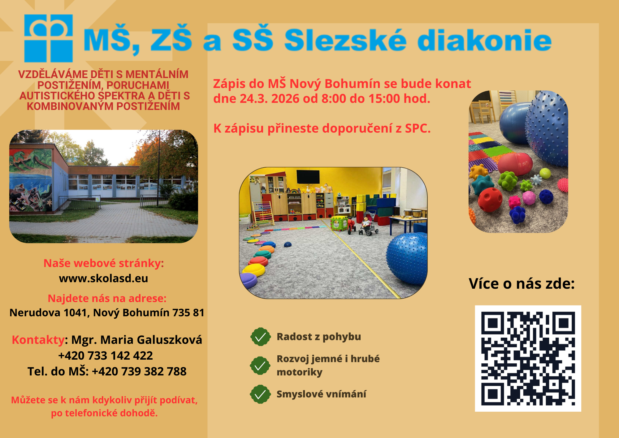 Zápisy do základní školy speciální budou na všech pracovištích probíhat začátkem roku 2026, VIZ DOKUMENTY NÍŽE. V případě zájmu o přestup do naší základní školy, kontaktujte zástupkyni ředitelky školy PhDr. Mgr. Irenu Čechovou.